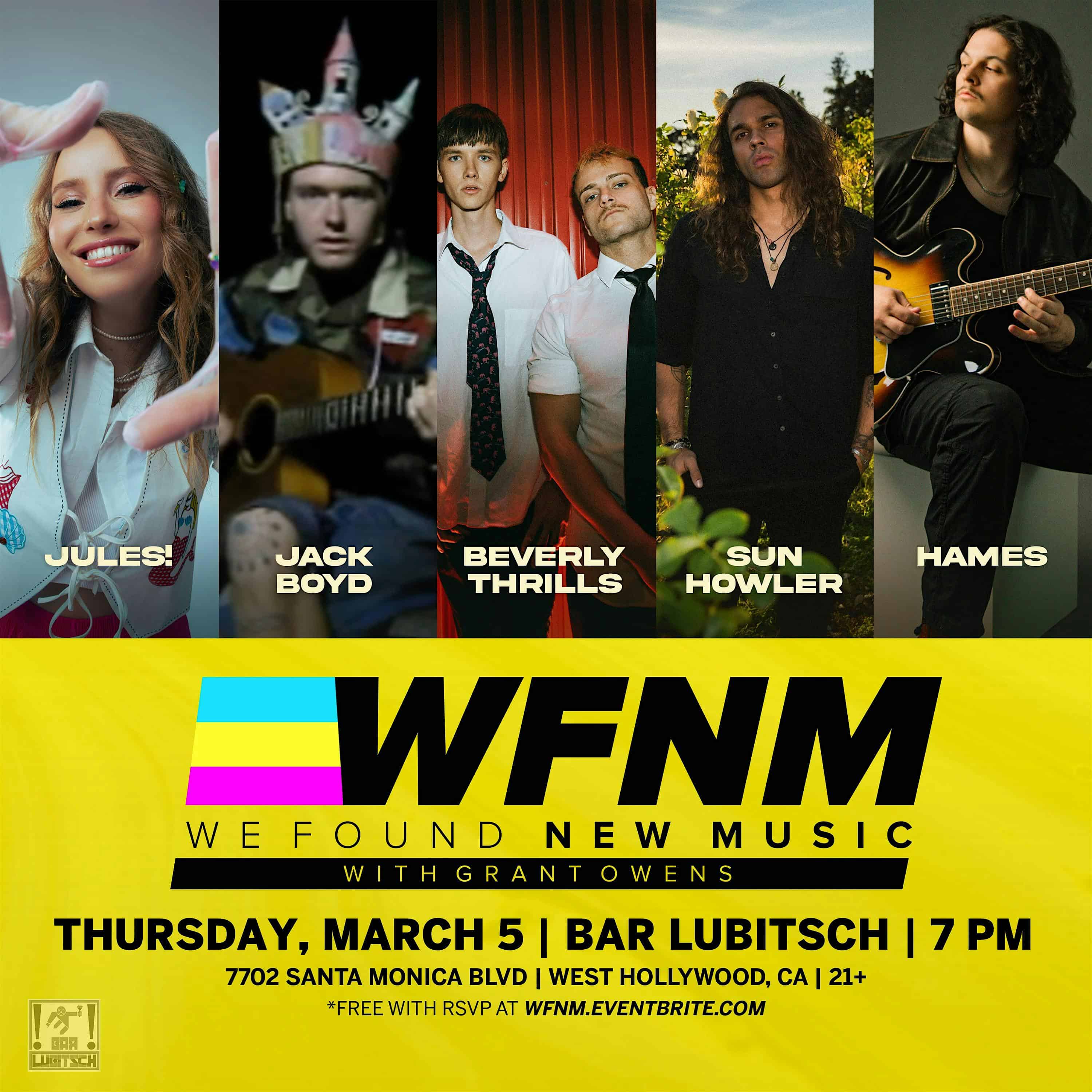 by admin23Feb HAMES, Sun Howler, Jack Boyd, Beverly Thrills, JULES! at BAR LUBITSCH – West Hollywood, CA HAMES, Sun Howler, Jack Boyd, Beverly Thrills, JULES! at BAR LUBITSCH – West Hollywood, CA 2 2 people viewed this event. WE FOUND NEW MUSIC Artist Discovery Concert Series LOCATION: Bar Lubitsch Free with RSVP 21+. 7:00pm Doors Tickets-RSVP Link Date And Time Thursday, March 5th, 2026 07:00 PM (PST) Venue BAR LUBITSCH Location 7702 Santa Monica Blvd, West Hollywood, CA 90046 Event Types Concert or PerformanceMusic Event Category California Share With Friends Facebook Twitter Linkedin Xing Pinterest Share This Post: