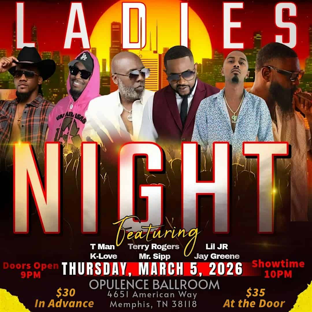 by admin23Feb Ladies Night at OPULENCE BALLROOM – Memphis, TN Ladies Night at OPULENCE BALLROOM – Memphis, TN 1 1 people viewed this event. For the ladies! Live performances by T-Man, Terry Rogers, Lil JR, K-Love, Mr. Sipp, & Jay Greene. Tickets-RSVP Link Date And Time Thursday, March 5th, 2026 @ 10:00 PM Location 4651 American Way, Memphis, TN 38118 Event Types Food & DrinkParty or Social Gathering Event Category MemphisTennessee Share With Friends Facebook Twitter Linkedin Xing Pinterest Share This Post: