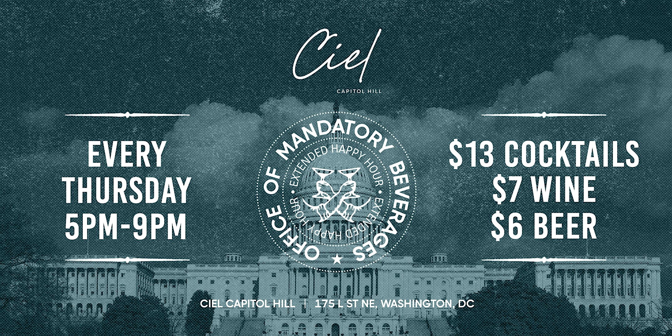 by admin27Feb O.M.B (Office of Manditory Beverages) Happy Hour at Ciel Capital Hill at Ciel Capitol Hill – Washington, DC O.M.B (Office of Manditory Beverages) Happy Hour at Ciel Capital Hill at Ciel Capitol Hill – Washington, DC 6 6 people viewed this event. Welcome to the Office of Mandatory Beverages, a “government-approved” happy hour. Enjoy exclusive specials with your government ID! Tickets-RSVP Link Date And Time Thursday, March 5th, 2026 @ 05:00 PM Location 175 L Street Northeast, Washington, DC 20002 Event Types Food & DrinkParty or Social Gathering Event Category Washington DC Share With Friends Facebook Twitter Linkedin Xing Pinterest Share This Post: