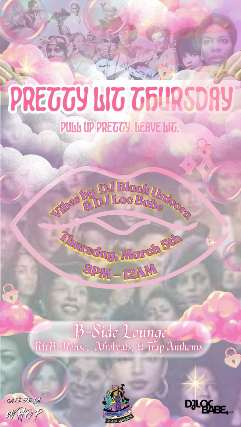 Thursday, March 5th8:00P – 12:00APRETTY LIT THURSDAYS: Womens History MonthMarch is Womens History Month, and were celebrating the women who came before us and the women were becoming! Pretty Lit Thursday is your space to breathe, unwind, dance, and remember yourself – a night rooted in joy, music, and sisterhood.Pull up pretty. Leave lit. Music By: DJ Black Unicorn & DJ Loc Babe