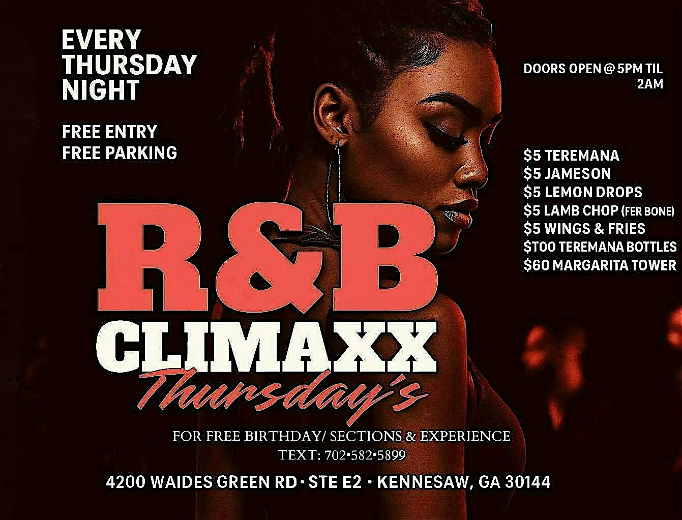 by admin27Feb R&B CLIMAXX THURSDAYS at Pizookah Lounge – Kennesaw, GA R&B CLIMAXX THURSDAYS at Pizookah Lounge – Kennesaw, GA 2 2 people viewed this event. PLACE WHERE REAL R&B and KARAOKE VIBES ARE!!! WE HAVE A $5 MENU• $5 DRINKS • $20 HOOKAHS • $60 TOWERS• $100 BOTTLES OF TEREMANA ALL NIGHT!!! Tickets-RSVP Link Date And Time Thursday, March 5th, 2026 08:00 PM (PST) Venue Pizookah Lounge Location 4200 Wade Green Road Northwest, Kennesaw, GA 30144 Event Types Concert or PerformanceMusic Event Category Georgia Share With Friends Facebook Twitter Linkedin Xing Pinterest Share This Post: