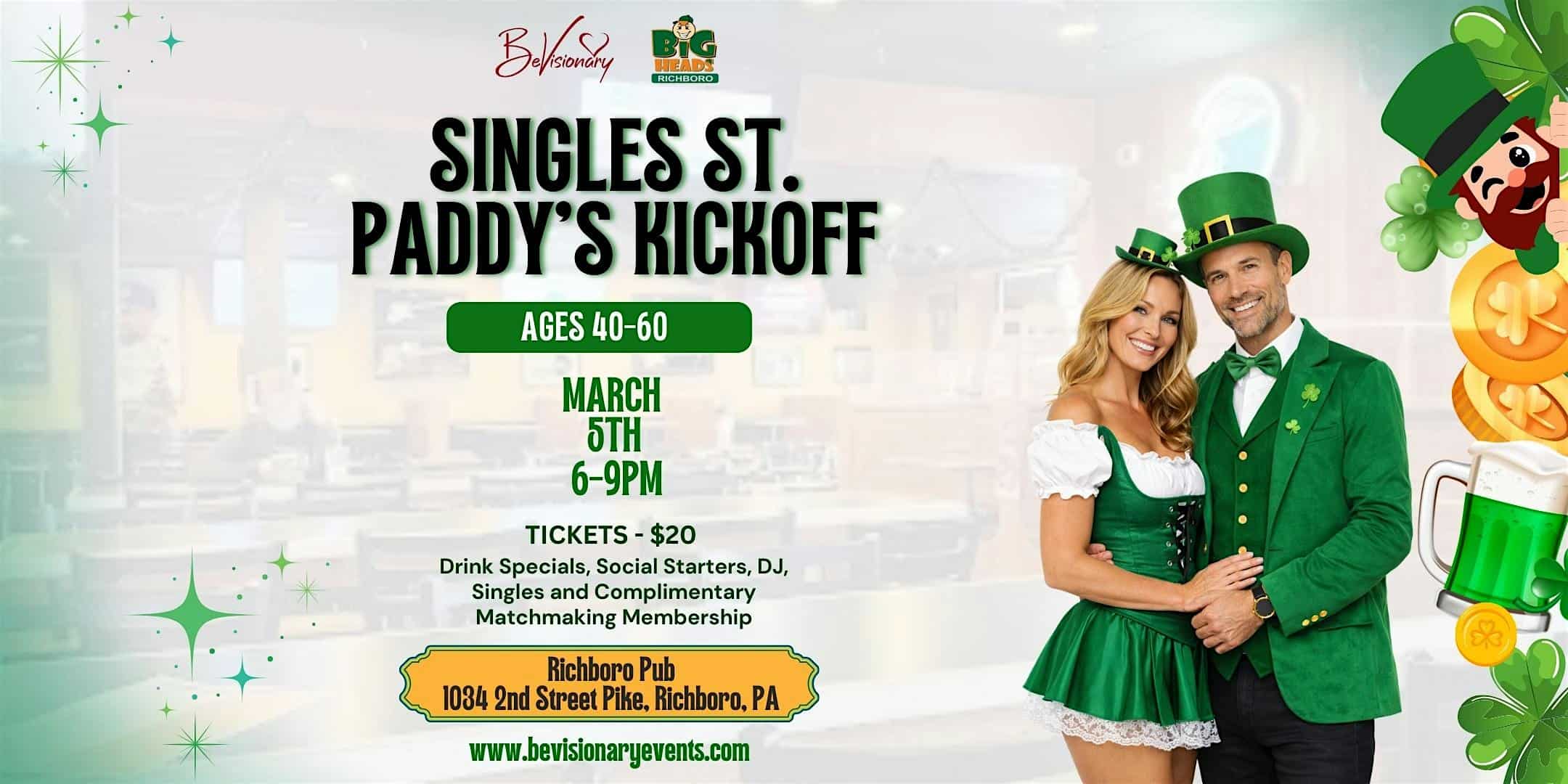 by admin23Feb Singles St. Paddy’s Kickoff at Richboro Pub – Richboro, PA Singles St. Paddy’s Kickoff at Richboro Pub – Richboro, PA 1 1 people viewed this event. Singles St. Paddy’s Kickoff (40–60): March 5, 6–9 PM at Richboro Pub. Drinks, DJ, guided mingling & local singles—no pressure. Tickets-RSVP Link Date And Time Thursday, March 5th, 2026 @ 06:00 PM Location 1034 Second Street Pike, Richboro, PA 18954 Event Types Party or Social Gathering Event Category Pennsylvania Share With Friends Facebook Twitter Linkedin Xing Pinterest Share This Post: