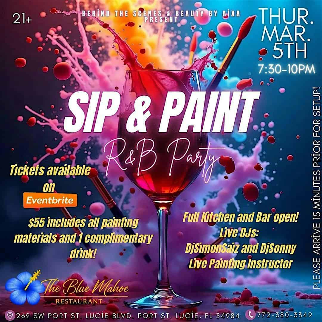 by admin23Feb Sip and Paint R&B Party at The Blue Mahoe – Port St. Lucie, FL Sip and Paint R&B Party at The Blue Mahoe – Port St. Lucie, FL 2 2 people viewed this event. Unwind with soulful R&B vibes, drinks, food and creativity at our chill Sip and Paint party! Tickets-RSVP Link Date And Time Thursday, March 5th, 2026 @ 07:00 PM Location 269 Southwest Port Saint Lucie Boulevard, Port St. Lucie, FL 34984 Event Types Party or Social GatheringPerforming & Visual Arts Event Category Florida Share With Friends Facebook Twitter Linkedin Xing Pinterest Share This Post: