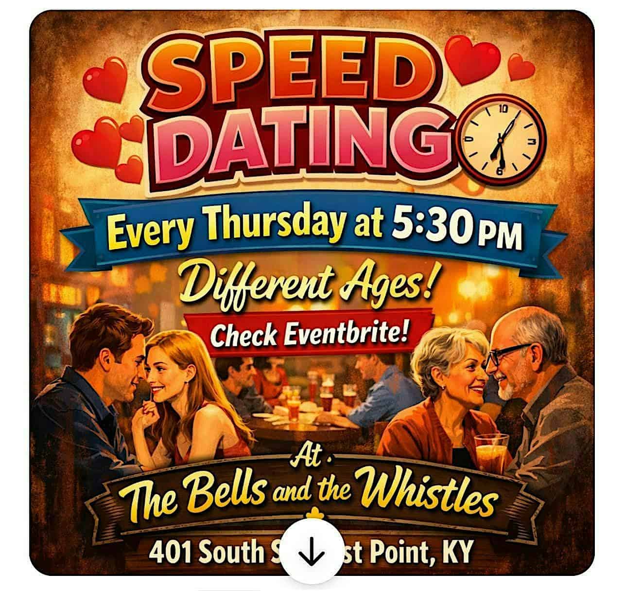 by admin23Feb Speed dating ages 21-34 at The Bells and The Whistles 401 South str West Point Ky. – West Point, KY Speed dating ages 21-34 at The Bells and The Whistles 401 South str West Point Ky. – West Point, KY 2 2 people viewed this event. Quick, fun face-to-face speed dating for singles aged 21-34 looking to make real connections! Tickets-RSVP Link Date And Time Thursday, March 5th, 2026 @ 05:00 PM Location 401 South Street West Point Ky., West Point, KY 40177 Event Types Community & CultureParty or Social Gathering Event Category Kentucky Share With Friends Facebook Twitter Linkedin Xing Pinterest Share This Post:
