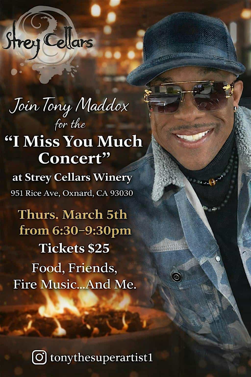 by admin23Feb Tony’s “Miss You Much” Concert at Strey Cellars – Oxnard, CA Tony’s “Miss You Much” Concert at Strey Cellars – Oxnard, CA 3 3 people viewed this event. Tony’s “Miss You Much” Concert is gonna be a blast—come vibe, sing, and feel the love live! Tickets-RSVP Link Date And Time Thursday, March 5th, 2026 06:00 PM (PST) Venue Strey Cellars Location 951 Rice Ave., Oxnard, CA 93030 Event Types Concert or PerformanceMusic Event Category California Share With Friends Facebook Twitter Linkedin Xing Pinterest Share This Post: