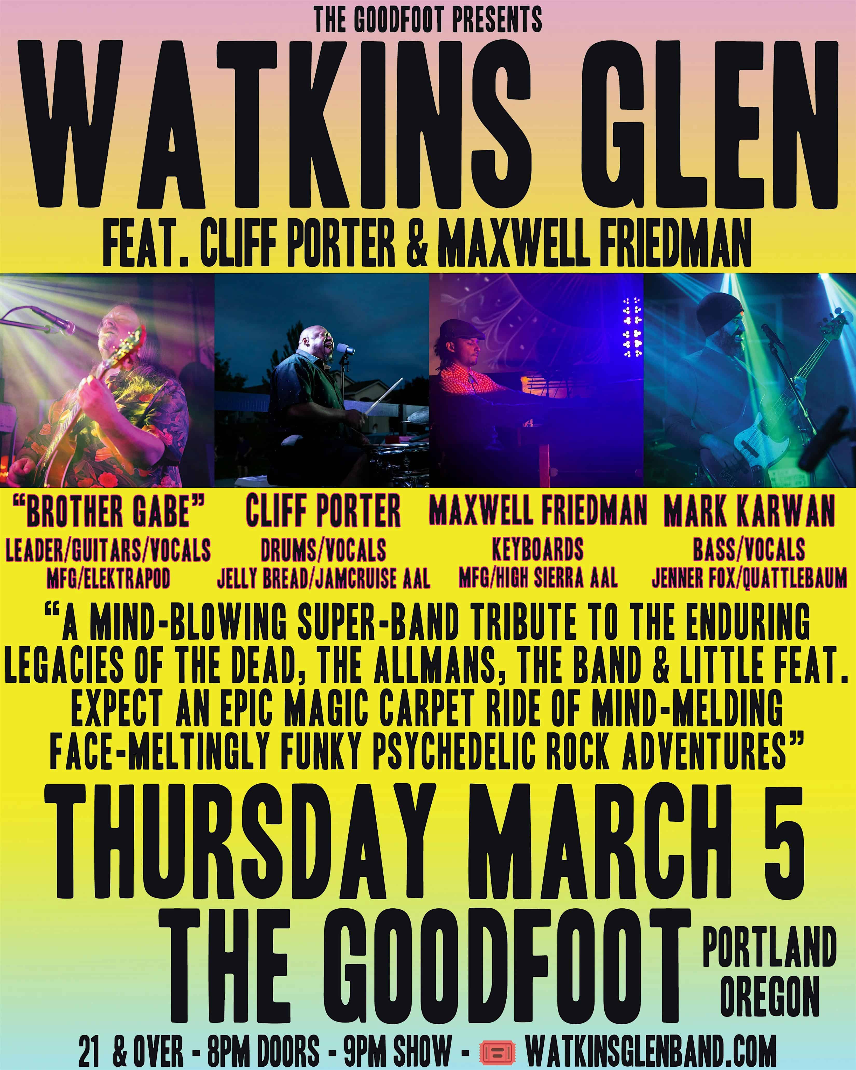 by admin23Feb Watkins Glen at Goodfoot Pub & Lounge – Portland, OR Watkins Glen at Goodfoot Pub & Lounge – Portland, OR 3 3 people viewed this event. WATKINS GLEN returns to the Goodfoot with their dazzling mashup tribute to the Grateful Dead, the Allman Brothers Band & The Band . Tickets-RSVP Link Date And Time Thursday, March 5th, 2026 08:00 PM (PST) Venue Goodfoot Pub & Lounge Location 2845 SE Stark St, Portland, OR 97214 Event Types Concert or PerformanceMusic Event Category OregonPortland Share With Friends Facebook Twitter Linkedin Xing Pinterest Share This Post: