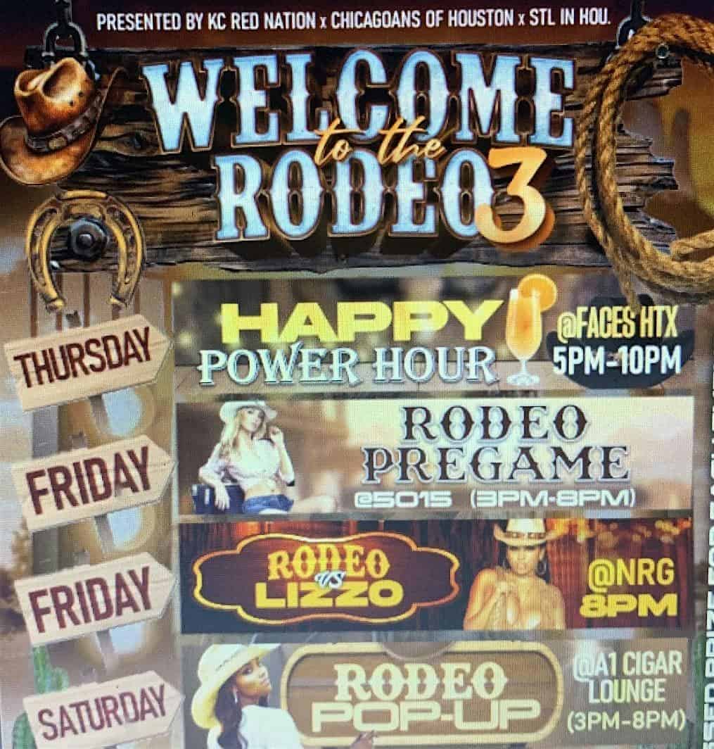 by admin14Feb Welcome to the Rodeo 3 at NRG – Houston, TX Welcome to the Rodeo 3 at NRG – Houston, TX 2 2 people viewed this event. This is the 3rd year we’ve planned events around Houston Rodeo’s Heritage Night. Hosting cities will be KC, Chicago, and Stl. Grab a friend! Tickets-RSVP Link Date And Time Thursday, March 5th, 2026 11:00 PM (PST) Venue NRG Location 1 NRG pkwy, Houston, TX 77054 Event Types Concert or PerformanceSports & Fitness Event Category HoustonTexas Share With Friends Facebook Twitter Linkedin Xing Pinterest Share This Post: