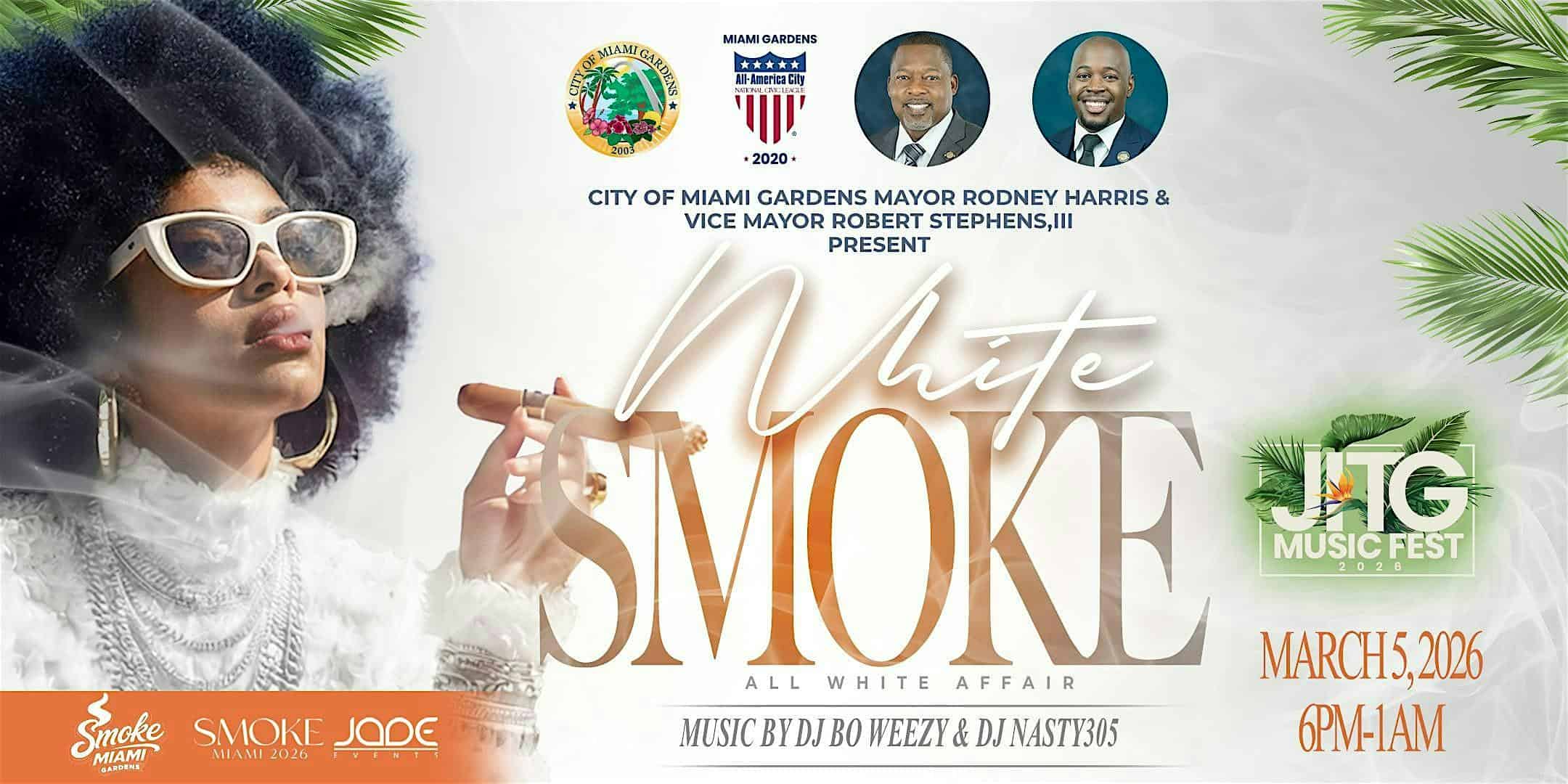 by admin23Feb White Smoke: Jazz in the Gardens Kickoff Rooftop Social at Miami Gardens City Hall Rooftop – Miami Gardens, FL White Smoke: Jazz in the Gardens Kickoff Rooftop Social at Miami Gardens City Hall Rooftop – Miami Gardens, FL 2 2 people viewed this event. Kick off Jazz in the Gardens weekend in style at White Smoke, an elevated rooftop social experience Tickets-RSVP Link Date And Time Thursday, March 5th, 2026 @ 06:00 PM Location 18605 Northwest 27th Avenue, Miami Gardens, FL 33056 Event Types MusicParty or Social Gathering Event Category FloridaMiami Share With Friends Facebook Twitter Linkedin Xing Pinterest Share This Post: