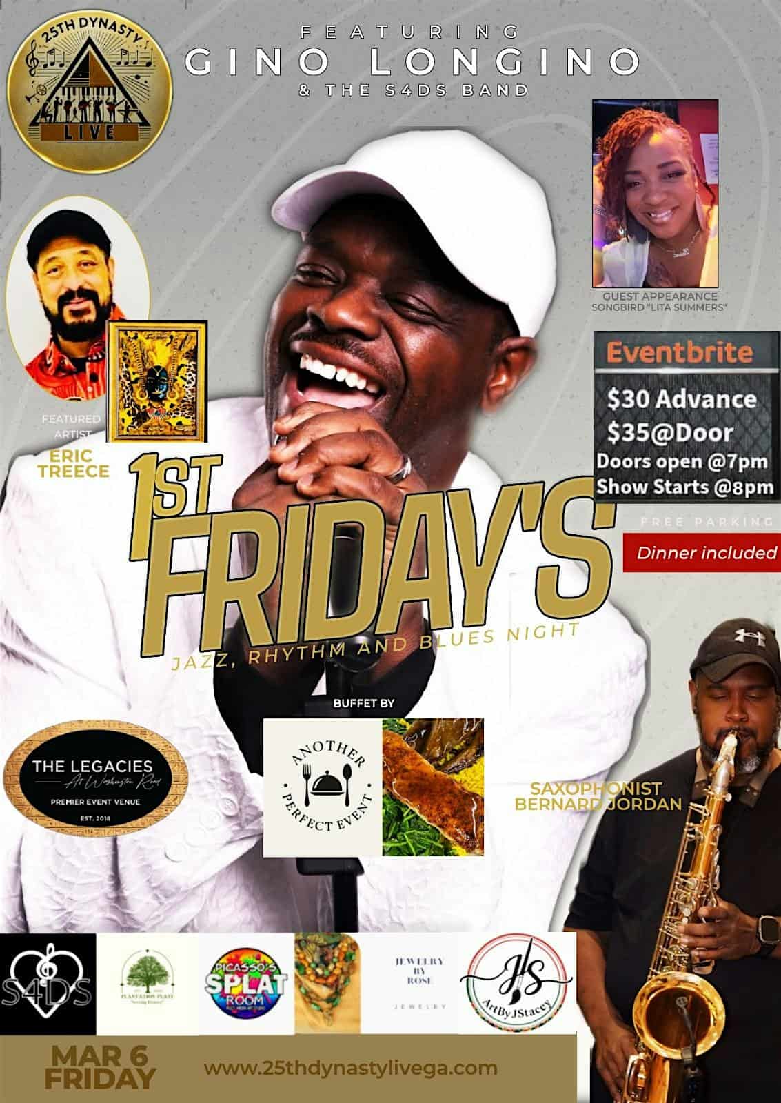 by admin23Feb 25th Dynasty LIVE 1st Friday’s Jazz. Rhythm and Blues Night at 1823 Washington Rd – East Point, GA 25th Dynasty LIVE 1st Friday’s Jazz. Rhythm and Blues Night at 1823 Washington Rd – East Point, GA 1 1 people viewed this event. 25th Dynasty LIVE presents Gino Longino & the Something for the Soul Band w/Special Guest Songbird Lita Summers & Saxophonist Bernard Jordan Tickets-RSVP Link Date And Time Friday, March 6th, 2026 07:00 PM (PST) Venue 1823 Washington Rd Location 1823 Washington Road, East Point, GA 30344 Event Types Concert or PerformanceMusic Event Category AtlantaGeorgia Share With Friends Facebook Twitter Linkedin Xing Pinterest Share This Post: