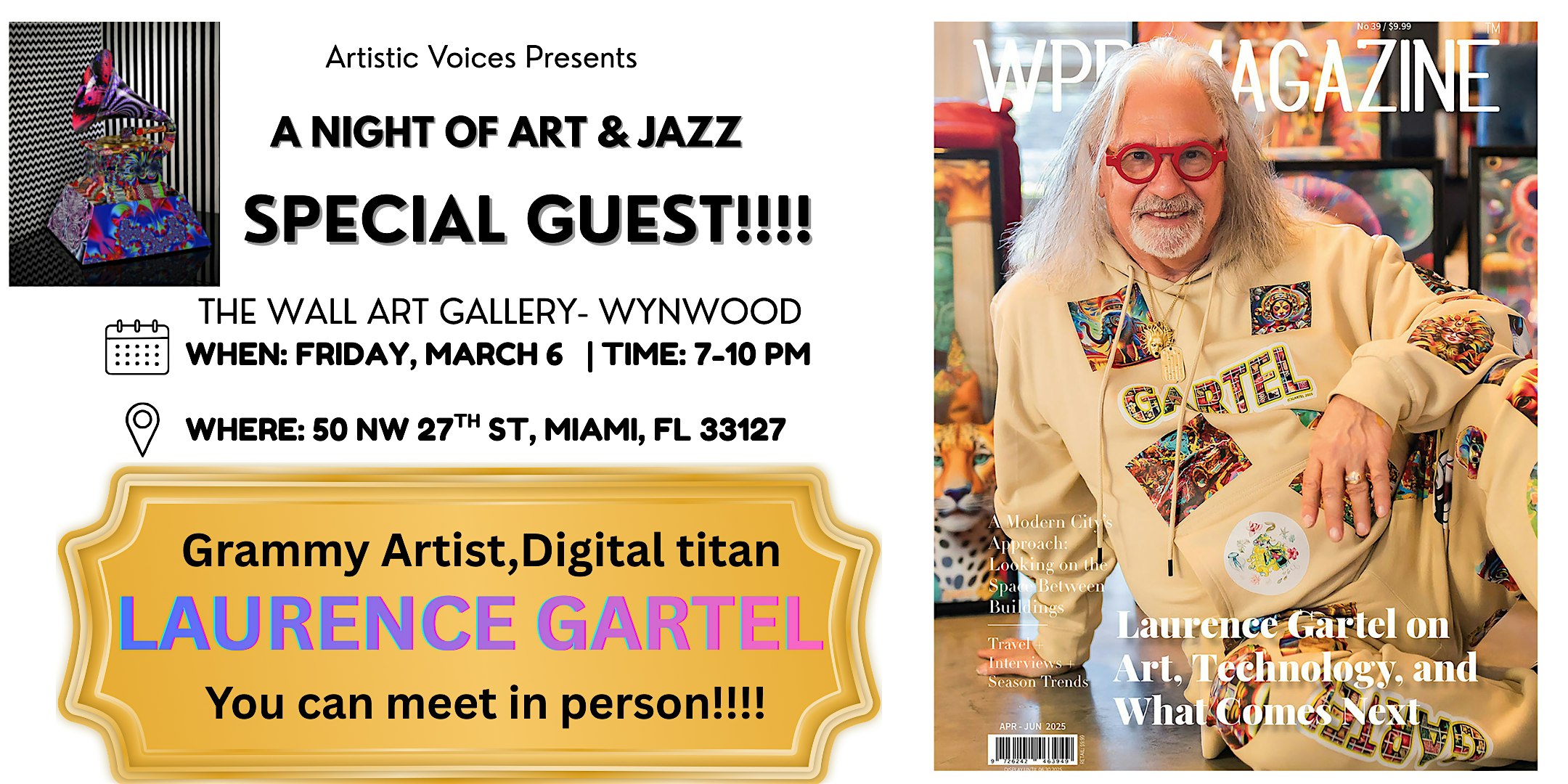 by admin05Mar An Evening of Live Jazz, Fine Drinks, and Special guest-Laurence Gartel! at The Wall Art Gallery – Miami, FL An Evening of Live Jazz, Fine Drinks, and Special guest-Laurence Gartel! at The Wall Art Gallery – Miami, FL 2 2 people viewed this event. An Evening of Live Jazz, Fine Drinks, and Inspiring Art Stories Tickets-RSVP Link Date And Time Friday, March 6th, 2026 07:00 PM (PST) Venue The Wall Art Gallery Location 50 Northwest 27th Street, Miami, FL 33127 Event Types Concert or PerformanceMusic Event Category FloridaMiami Share With Friends Facebook Twitter Linkedin Xing Pinterest Share This Post: