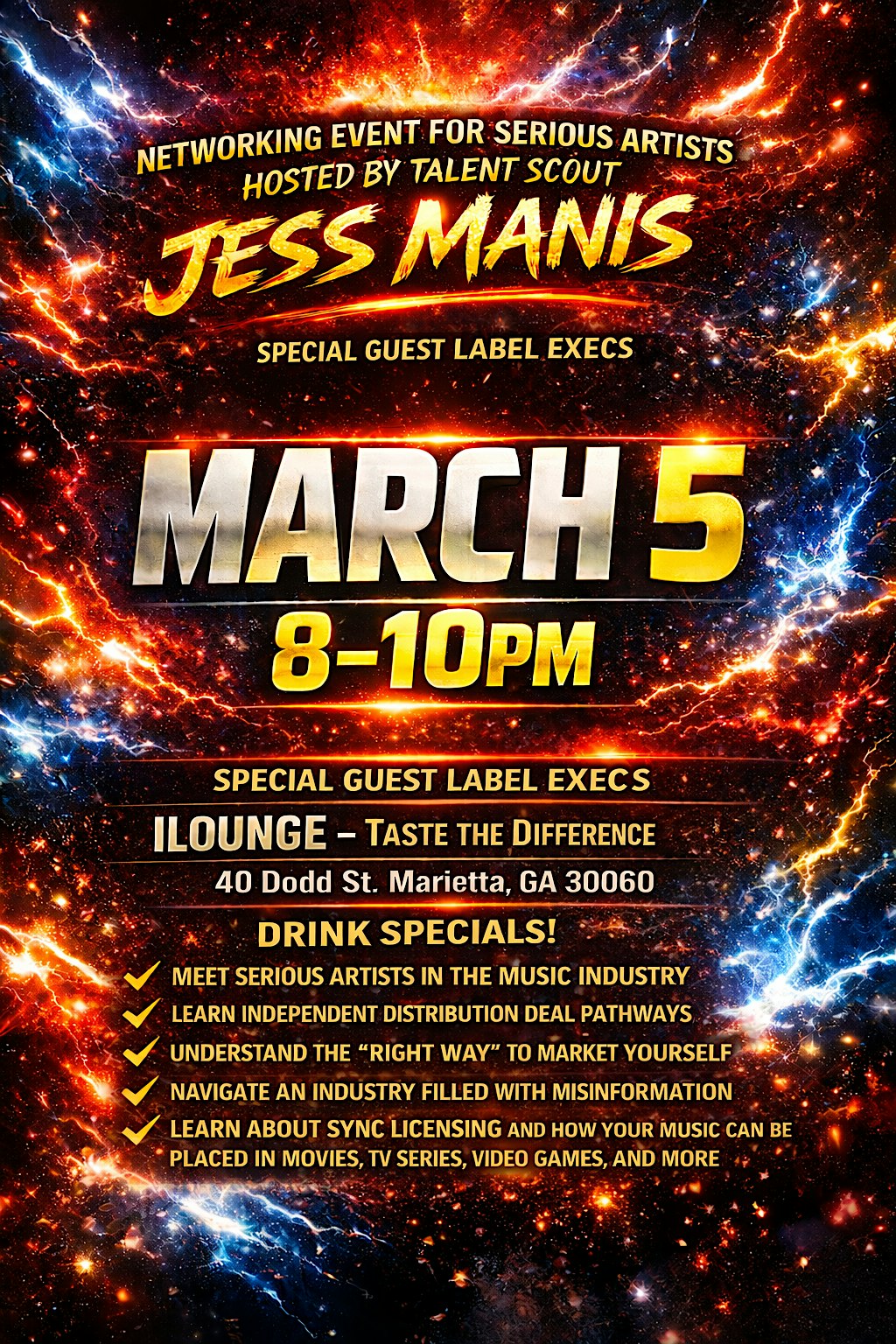by admin13Feb Artist Networking Event at ILOUNGE TASTE THE DIFFERENCE – Marietta, GA Artist Networking Event at ILOUNGE TASTE THE DIFFERENCE – Marietta, GA 2 2 people viewed this event. Artist Networking Event— Serious Artist only! Tickets-RSVP Link Date And Time Friday, March 6th, 2026 01:00 AM (PST) Venue ILOUNGE TASTE THE DIFFERENCE Location 40 Dodd Street Southeast, Marietta, GA 30060 Event Types Music Event Category AtlantaGeorgia Share With Friends Facebook Twitter Linkedin Xing Pinterest Share This Post: