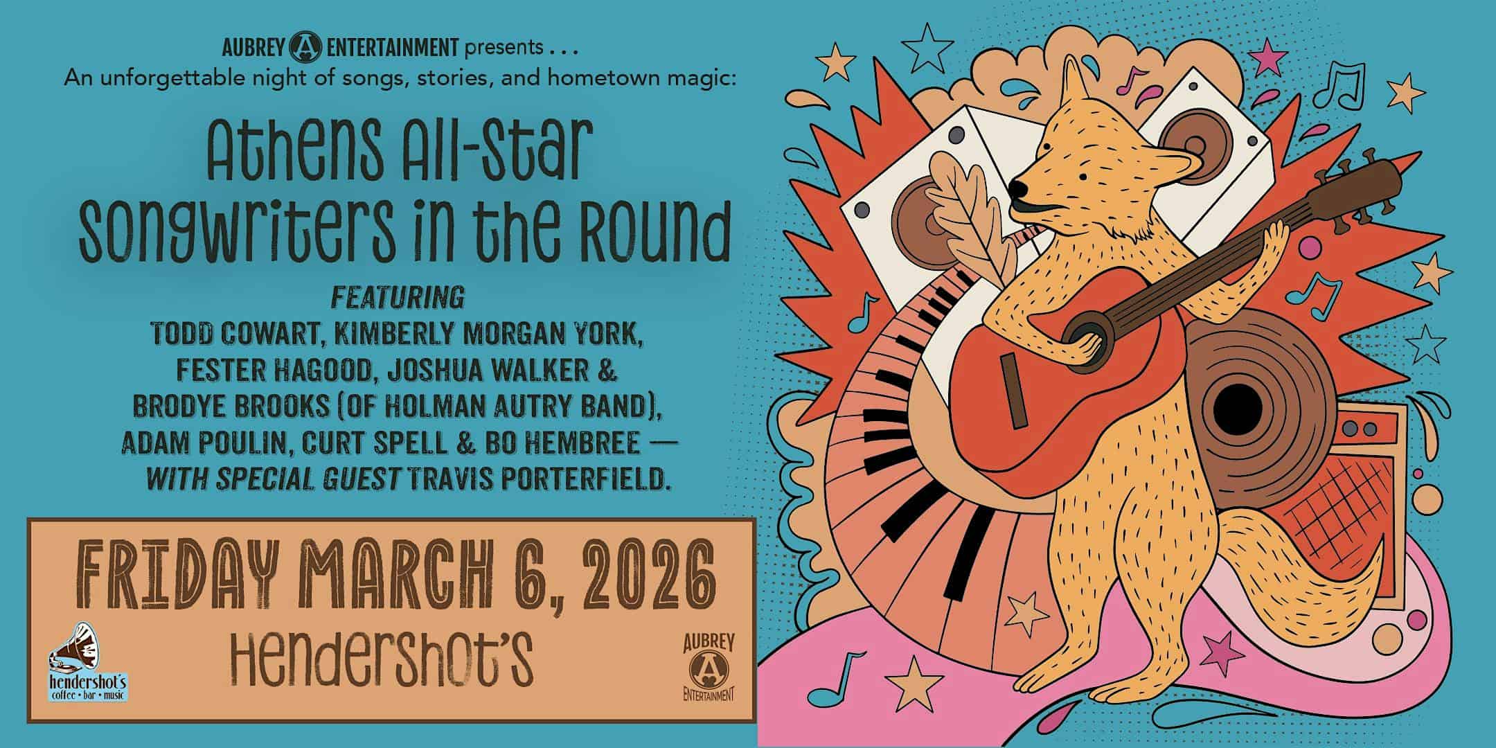 by admin23Feb Athens All-Star Songwriters in the Round @ Hendershot’s at Hendershot’s – Athens, GA Athens All-Star Songwriters in the Round @ Hendershot’s at Hendershot’s – Athens, GA 1 1 people viewed this event. An all-star Athens songwriter in the round at Hendershot’s in Athens, GA – up close and intimate songs by some of Athens best songsmiths! Tickets-RSVP Link Date And Time Friday, March 6th, 2026 08:00 PM (PST) Venue Hendershot's Location 237 Prince Avenue, Athens, GA 30601 Event Types Concert or PerformanceMusic Event Category Georgia Share With Friends Facebook Twitter Linkedin Xing Pinterest Share This Post: