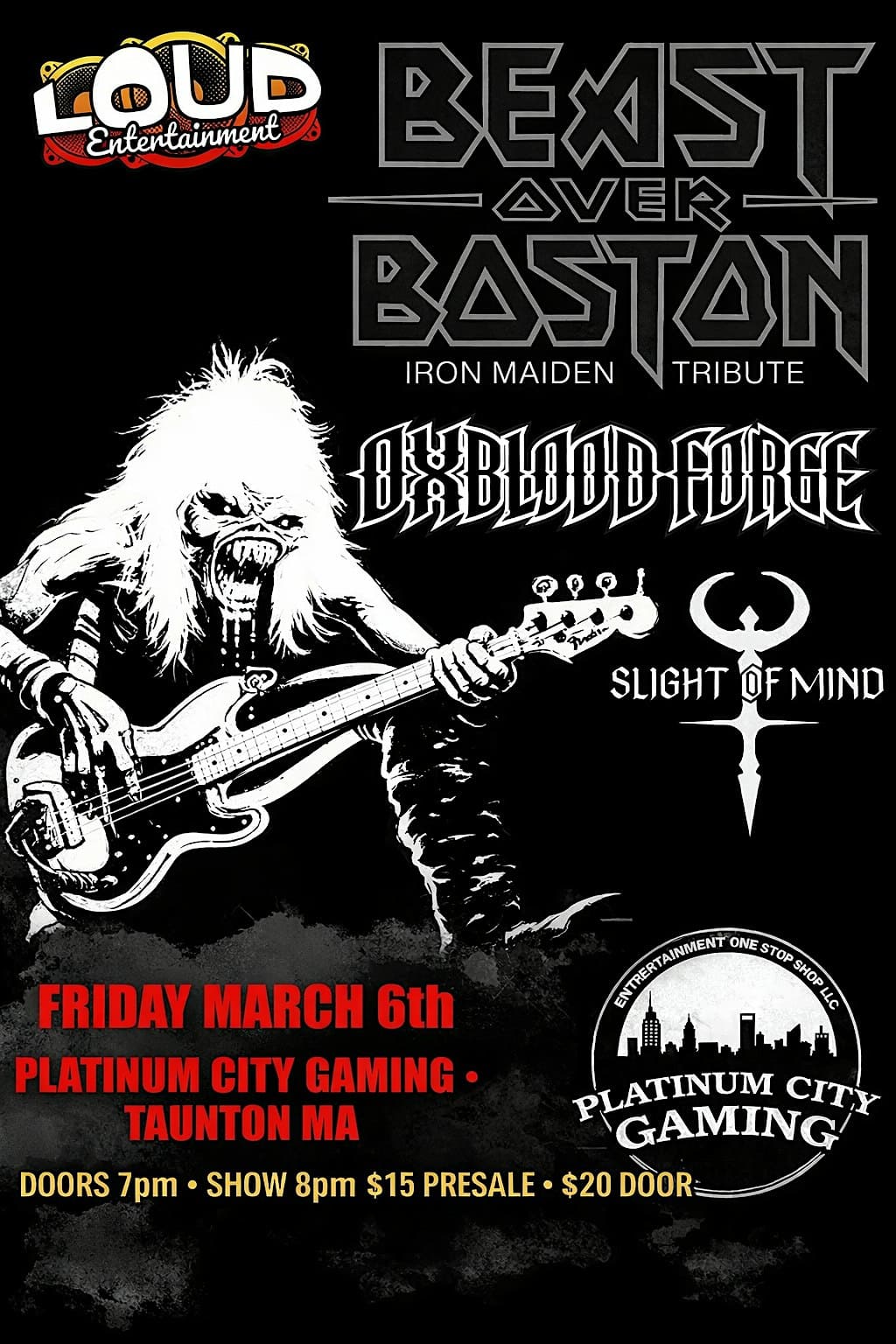 BEAST OVER BOSTON, OXBLOOD FORGE, and SLIGHT OF MIND at Platinum City Gaming -Bar-Gaming Lounge- Arcade- Nerf Arena-Gellyball-Smash Room -Rage Room-Basketball – Taunton, MA