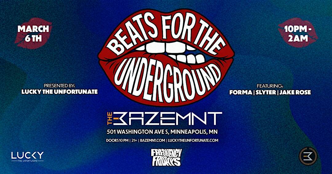 by admin23Feb BEATS FOR THE UNDERGROUND at The Bazemnt Lounge – Minneapolis, MN BEATS FOR THE UNDERGROUND at The Bazemnt Lounge – Minneapolis, MN 1 1 people viewed this event. BEATS FOR THE UNDERGROUND is a monthly house music night focused on connection, movement, & late-night energy. Tech-house & techno all night Tickets-RSVP Link Date And Time Friday, March 6th, 2026 10:00 PM (PST) Venue The Bazemnt Lounge Location 501 Washington Avenue South, Minneapolis, MN 55415 Event Types Concert or PerformanceMusic Event Category MinneapolisMinnesota Share With Friends Facebook Twitter Linkedin Xing Pinterest Share This Post: