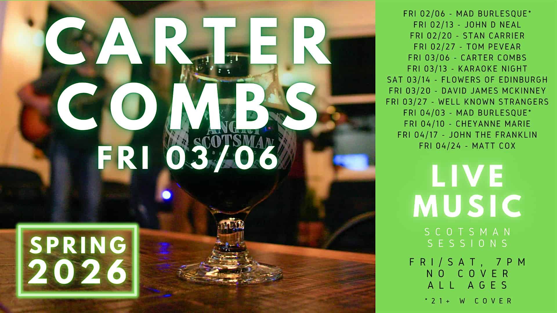 by admin23Feb Carter Combs Live Performance at Angry Scotsman Brewing at Angry Scotsman Brewing – Oklahoma City, OK Carter Combs Live Performance at Angry Scotsman Brewing at Angry Scotsman Brewing – Oklahoma City, OK 1 1 people viewed this event. Hailing from Inola, OK, Carter’s vessel of musical expression is the acoustic guitar, and we’re excited to welcome him back to ASB. Tickets-RSVP Link Date And Time Friday, March 6th, 2026 07:00 PM (PST) Venue Angry Scotsman Brewing Location 704 West Reno Avenue, Oklahoma City, OK 73102 Event Types Concert or PerformanceMusic Event Category OklahomaOklahoma City Share With Friends Facebook Twitter Linkedin Xing Pinterest Share This Post: