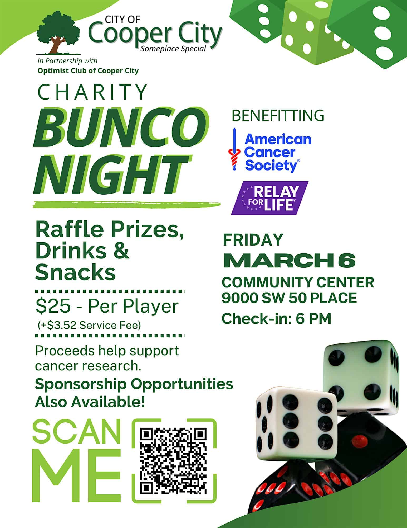 by admin23Feb Charity Bunco Night at Cooper City Community Center – Cooper City, FL Charity Bunco Night at Cooper City Community Center – Cooper City, FL 2 2 people viewed this event. Let’s roll and fight cancer! We’re hosting a Bunco Night with proceeds helping support the American Cancer Society’s Relay for Life. Tickets-RSVP Link Date And Time Friday, March 6th, 2026 @ 06:00 PM Location 9000 Southwest 50th Place, Cooper City, FL 33328 Event Types Charity & CausesParty or Social Gathering Event Category Florida Share With Friends Facebook Twitter Linkedin Xing Pinterest Share This Post: