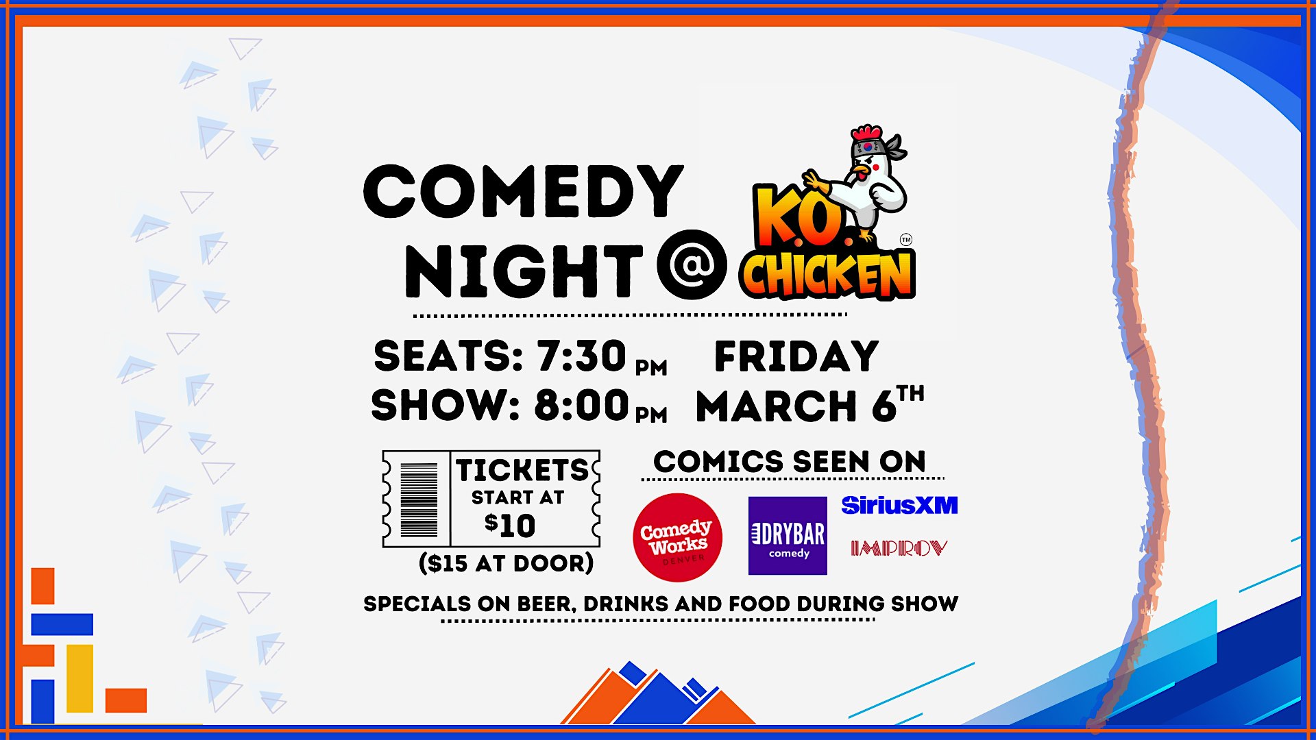by admin05Mar Comedy Night at KO Chicken at KO Chicken – Colorado Springs, CO Comedy Night at KO Chicken at KO Chicken – Colorado Springs, CO 2 2 people viewed this event. Comedy Night at Colorado Spring’s Best Spot for Chicken, Beer, and more, Friday March 6th featuring some of The Front Range’s Best Comics! Tickets-RSVP Link Date And Time Friday, March 6th, 2026 08:00 PM (PST) Venue KO Chicken Location 8041 Woodmen Center Heights, Colorado Springs, CO 80908 Event Types Concert or PerformanceFilm, Media & Entertainment Event Category ColoradoColorado Springs Share With Friends Facebook Twitter Linkedin Xing Pinterest Share This Post: