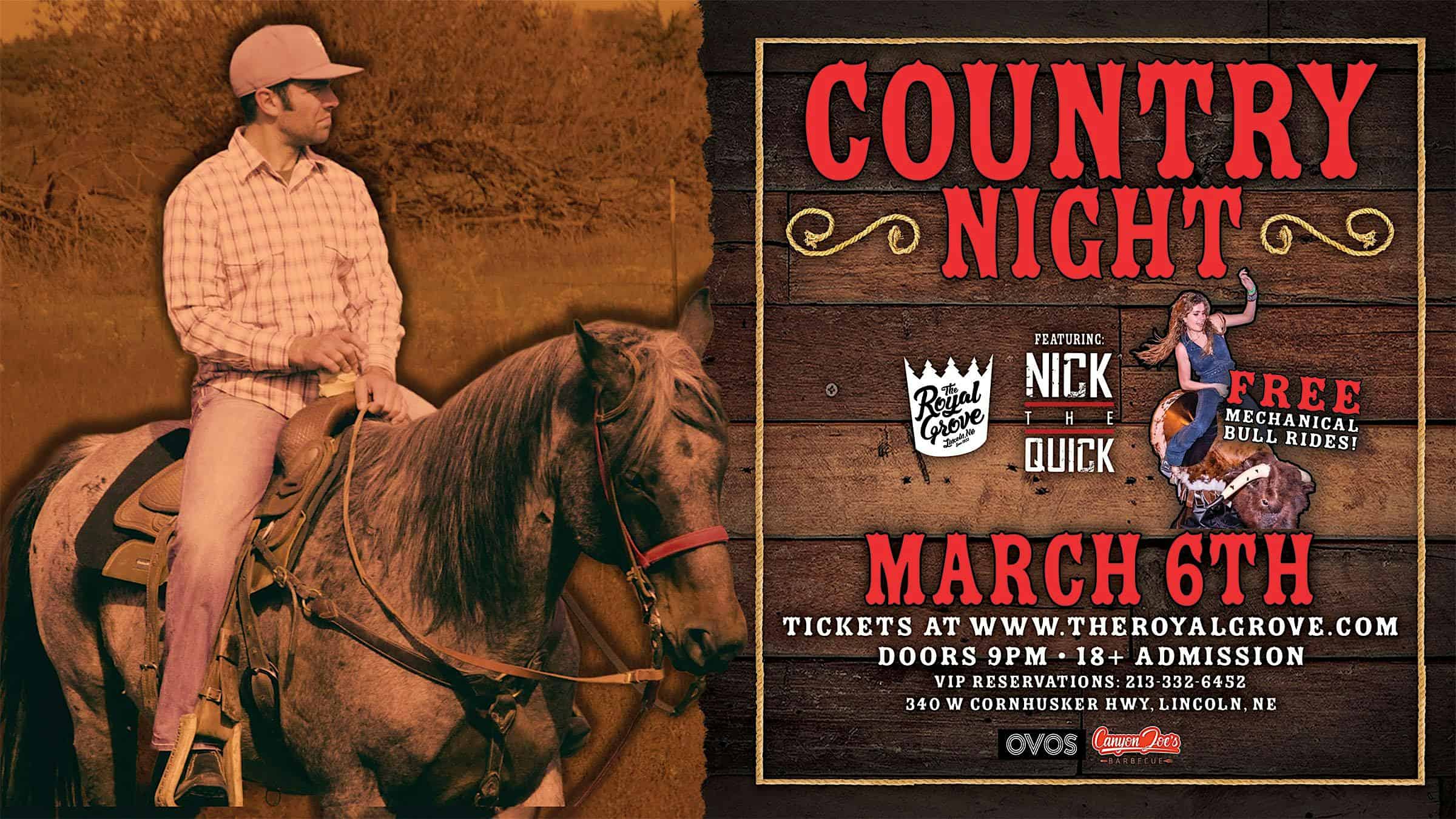 by admin23Feb Country Night with Nick the Quick at The Royal Grove – Lincoln, NE Country Night with Nick the Quick at The Royal Grove – Lincoln, NE 3 3 people viewed this event. Fri, Mar 6 at 09:00 PM CST at The Royal Grove Tickets-RSVP Link Date And Time Friday, March 6th, 2026 @ 09:00 PM Location 340 West Cornhusker Highway, Lincoln, NE 68521 Event Types MusicParty or Social Gathering Event Category Nebraska Share With Friends Facebook Twitter Linkedin Xing Pinterest Share This Post: