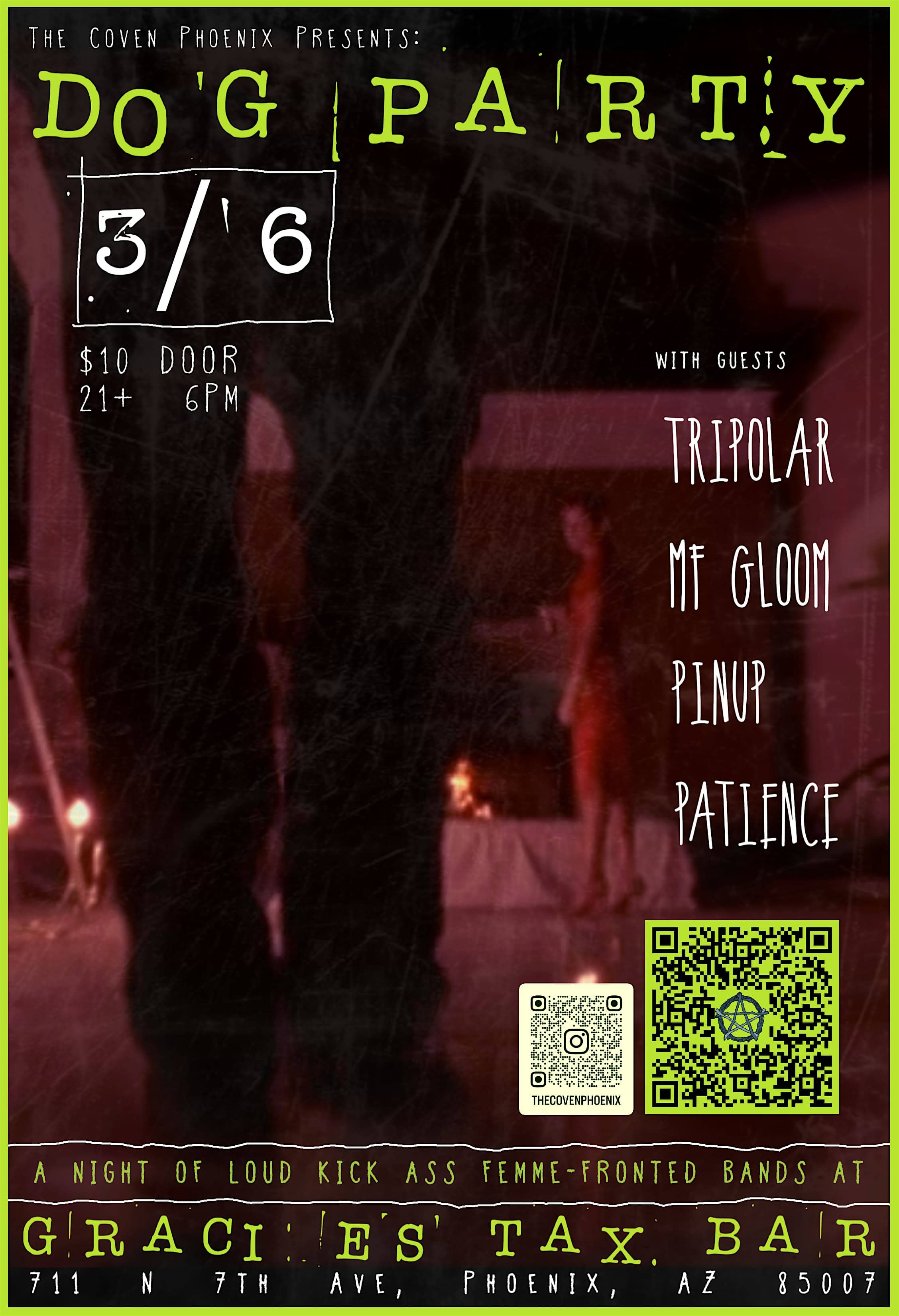 by admin23Feb DOG PARTY W/ MF GLOOM + TRIPOLAR + PINUP + PATIENCE AT GRACIES TAX BAR at Gracie’s Tax Bar – Phoenix, AZ DOG PARTY W/ MF GLOOM + TRIPOLAR + PINUP + PATIENCE AT GRACIES TAX BAR at Gracie’s Tax Bar – Phoenix, AZ 2 2 people viewed this event. Get ready to vibe with MF Gloom, Tripolar, Pinup, and Patience live at Gracies Tax Bar for an epic dog party! Tickets-RSVP Link Date And Time Friday, March 6th, 2026 @ 06:00 PM Location 711 North 7th Avenue, Phoenix, AZ 85007 Event Types MusicParty or Social Gathering Event Category ArizonaPhoenix Share With Friends Facebook Twitter Linkedin Xing Pinterest Share This Post: