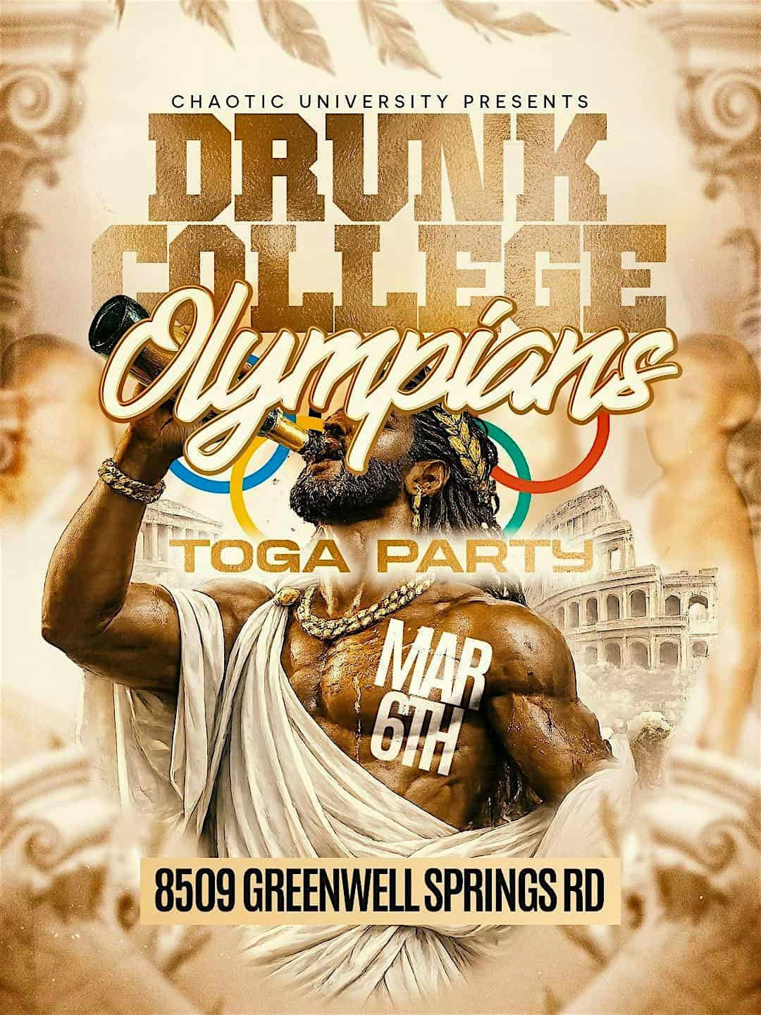 by admin23Feb “Drunk College Olympians” Toga Party at 8509 Greenwell Springs Rd – Baton Rouge, LA “Drunk College Olympians” Toga Party at 8509 Greenwell Springs Rd – Baton Rouge, LA 2 2 people viewed this event. “Drunk College Olympians” Toga Party Edition DIY Your Toga How You Want. March 6th We’re Greek For One Night! Tickets-RSVP Link Date And Time Friday, March 6th, 2026 10:00 PM (PST) Venue 8509 Greenwell Springs Rd Location 8509 Greenwell Springs Road, Baton Rouge, LA 70814 Event Types Party or Social GatheringSports & Fitness Event Category Baton RougeLouisiana Share With Friends Facebook Twitter Linkedin Xing Pinterest Share This Post:
