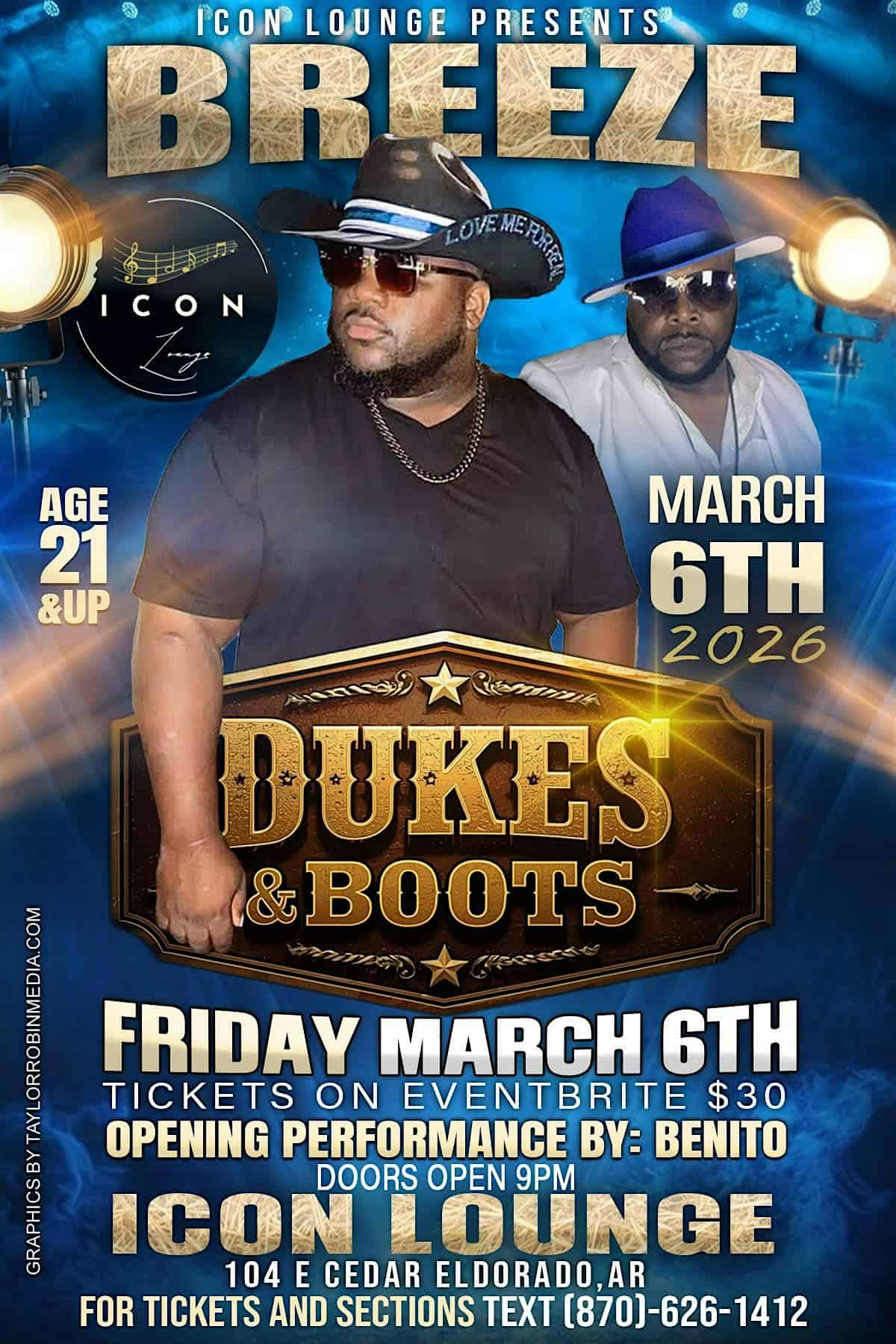 by admin23Feb Dukes & Boots – BreezeMrDo2much at 104 E Cedar St – El Dorado, AR Dukes & Boots – BreezeMrDo2much at 104 E Cedar St – El Dorado, AR 1 1 people viewed this event. Grab your Dukes & Boots and come out to Icon Lounge! Get ready to dance, sing, and line dance ALL NIGHT long with BreezeMrDo2much. Tickets-RSVP Link Date And Time Friday, March 6th, 2026 09:00 PM (PST) Venue 104 E Cedar St Location 104 East Cedar Street, El Dorado, AR 71730 Event Types Concert or PerformanceMusic Event Category Arkansas Share With Friends Facebook Twitter Linkedin Xing Pinterest Share This Post: