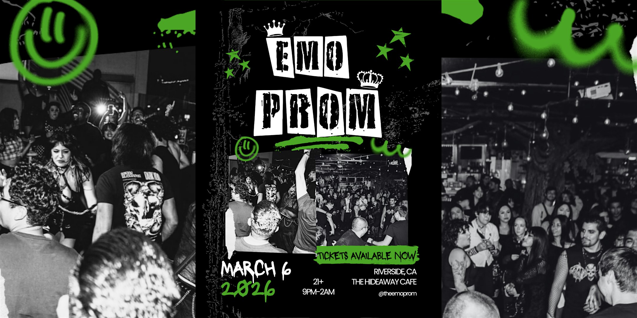 by admin27Feb EMO PROM – MAR 6 at THE HIDEAWAY CAFE & LOUNGE – Riverside, CA EMO PROM – MAR 6 at THE HIDEAWAY CAFE & LOUNGE – Riverside, CA 1 1 people viewed this event. Emo Prom Night — First Fridays at The Hideaway Café & Lounge, Downtown Riverside. Dress dark, sing loud, dance through the heartbreak. Tickets-RSVP Link Date And Time Friday, March 6th, 2026 09:00 PM (PST) Venue THE HIDEAWAY CAFE & LOUNGE Location 3660 Mission Inn Avenue, Riverside, CA 92501 Event Types MusicParty or Social Gathering Event Category California Share With Friends Facebook Twitter Linkedin Xing Pinterest Share This Post: