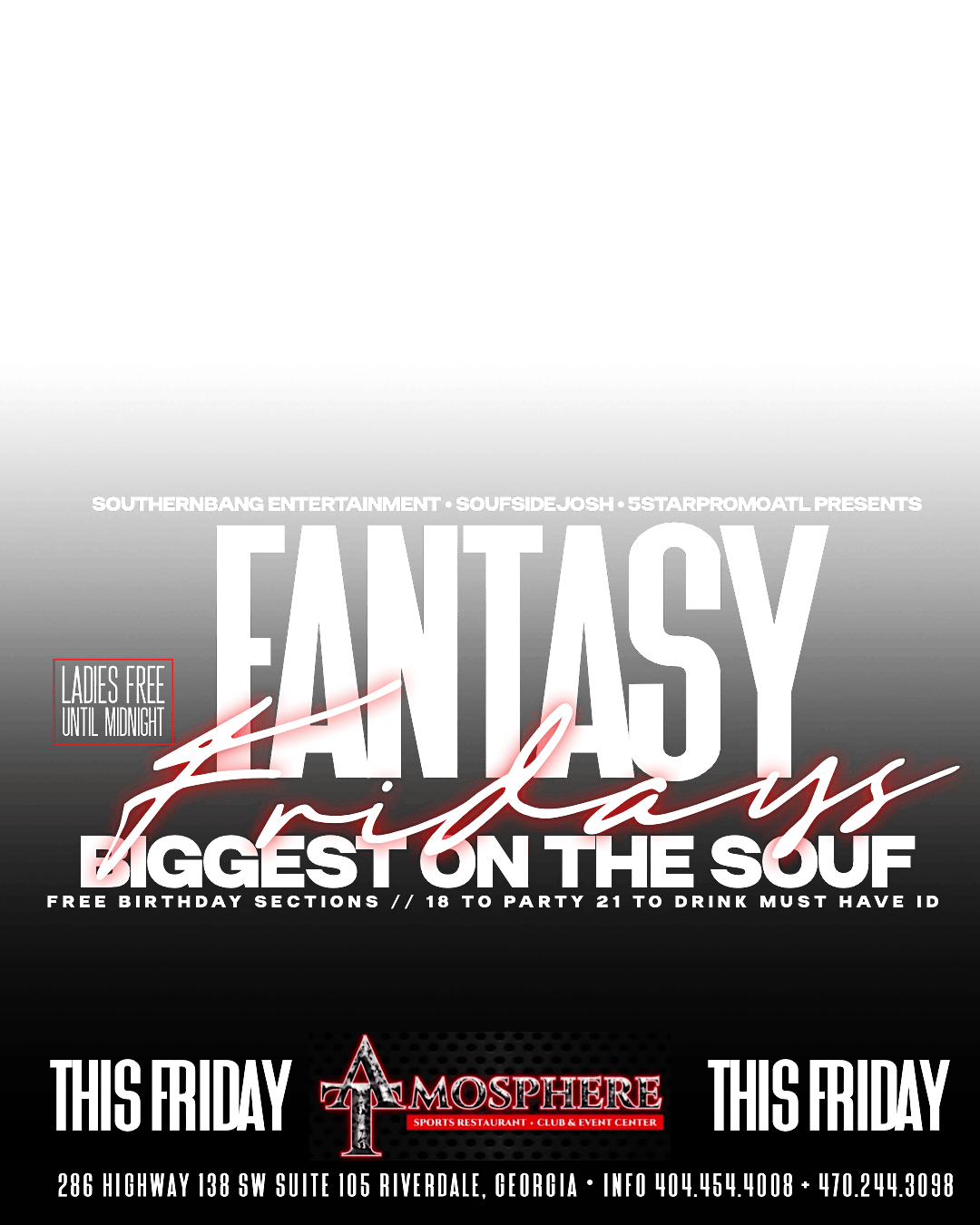 by admin27Feb FANTASY FRIDAYS at 286 GA-138 – Riverdale, GA FANTASY FRIDAYS at 286 GA-138 – Riverdale, GA 4 4 people viewed this event. A NIGHT ON THE SOUFSIDE OF METRO ATLANTA FEELED WITH GREAT VIBES FOOD & DRINKS WITH THE HOTTEST DJ PLAYING YOUR FAVORITE HITS Tickets-RSVP Link Date And Time Friday, March 6th, 2026 @ 09:00 PM Location 286 Georgia 138, Riverdale, GA 30274 Event Types Film, Media & EntertainmentParty or Social Gathering Event Category AtlantaGeorgia Share With Friends Facebook Twitter Linkedin Xing Pinterest Share This Post: