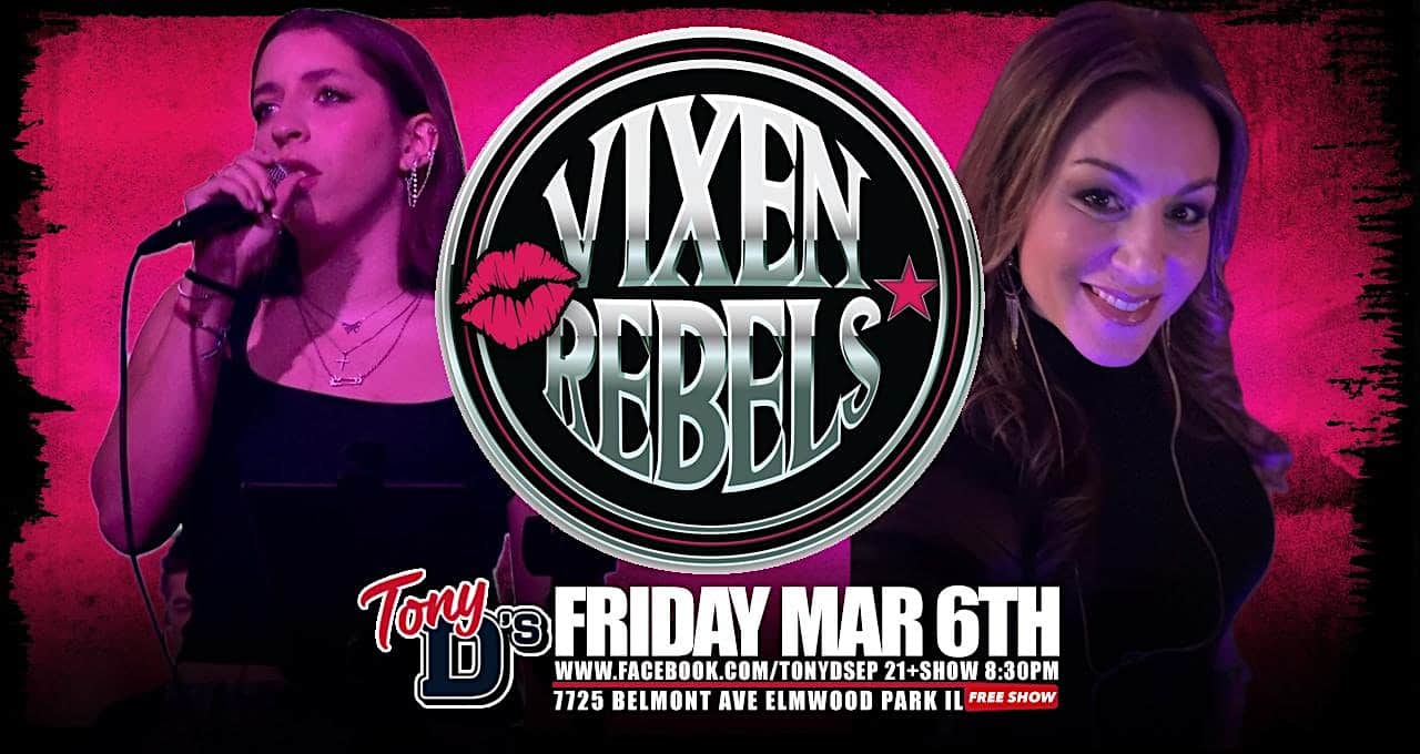 by admin23Feb Female Fronted Rock Cover Band Vixen Rebels at Tony D’s FREE SHOW at 7725 W Belmont Ave – Elmwood Park, IL Female Fronted Rock Cover Band Vixen Rebels at Tony D’s FREE SHOW at 7725 W Belmont Ave – Elmwood Park, IL 2 2 people viewed this event. Catch the fierce Vixen Rebels rockin’ Tony D’s live for FREE — all girl power, all killer covers! Tickets-RSVP Link Date And Time Friday, March 6th, 2026 08:00 PM (PST) Venue 7725 W Belmont Ave Location 7725 West Belmont Avenue, Elmwood Park, IL 60707 Event Types Concert or PerformanceMusic Event Category Illinois Share With Friends Facebook Twitter Linkedin Xing Pinterest Share This Post: