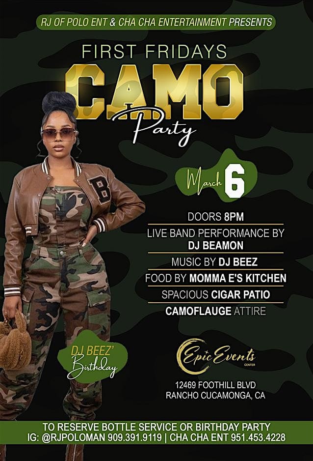 by admin23Feb First Friday CAMO Party Epic Center at Epic Events Center – Rancho Cucamonga, CA First Friday CAMO Party Epic Center at Epic Events Center – Rancho Cucamonga, CA 2 2 people viewed this event. Get ready to party hard and dance the night away at the First Friday CAMO Party – it’s going to be epic! Tickets-RSVP Link Date And Time Friday, March 6th, 2026 09:00 PM (PST) Venue Epic Events Center Location 12469 Foothill Boulevard, Rancho Cucamonga, CA 91739 Event Types MusicParty or Social Gathering Event Category California Share With Friends Facebook Twitter Linkedin Xing Pinterest Share This Post: