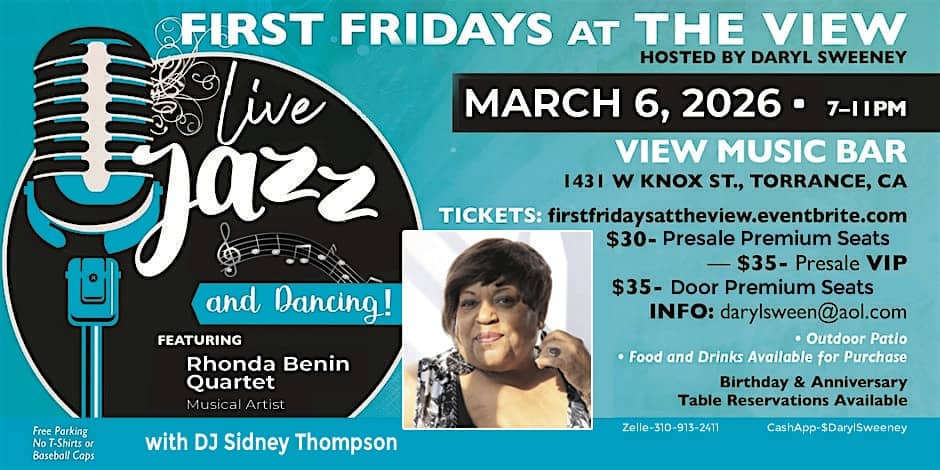 by admin23Feb First Fridays at the View Featuring The Rhonda Benin Quartet at View , Music Bar & Lounge – Torrance, CA First Fridays at the View Featuring The Rhonda Benin Quartet at View , Music Bar & Lounge – Torrance, CA 2 2 people viewed this event. First Fridays at the View is where grown folks come to listen to live jazz, dance and have a great time in an incredible venue. Tickets-RSVP Link Date And Time Friday, March 6th, 2026 07:00 PM (PST) Venue View , Music Bar & Lounge Location 1431 West Knox Street, Torrance, CA 90501 Event Types Concert or PerformanceMusic Event Category CaliforniaLos Angeles Share With Friends Facebook Twitter Linkedin Xing Pinterest Share This Post: