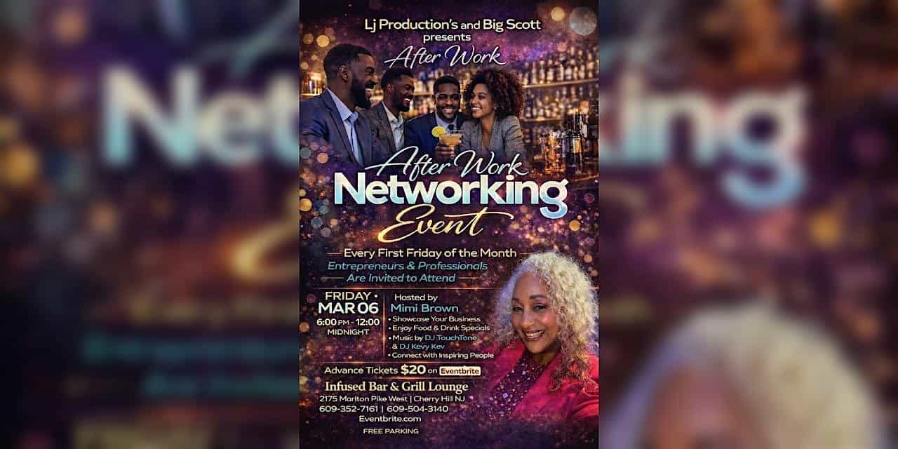 by admin14Feb First Friday’s Net Working Affair Hosted by Mimi Brown at Infused Restaurant & Bar – Cherry Hill Township, NJ First Friday’s Net Working Affair Hosted by Mimi Brown at Infused Restaurant & Bar – Cherry Hill Township, NJ 2 2 people viewed this event. First Friday’s Net Working Affair Hosted by Mimi Brown, Join us for good music, great drinks, and atmosphere made for grown folks. Tickets-RSVP Link Date And Time Friday, March 6th, 2026 11:00 PM (PST) Venue Infused Restaurant & Bar Location 2175 Marlton Pike, Cherry Hill Township, NJ 8002 Event Types Concert or PerformancePerforming & Visual Arts Event Category New Jersey Share With Friends Facebook Twitter Linkedin Xing Pinterest Share This Post: