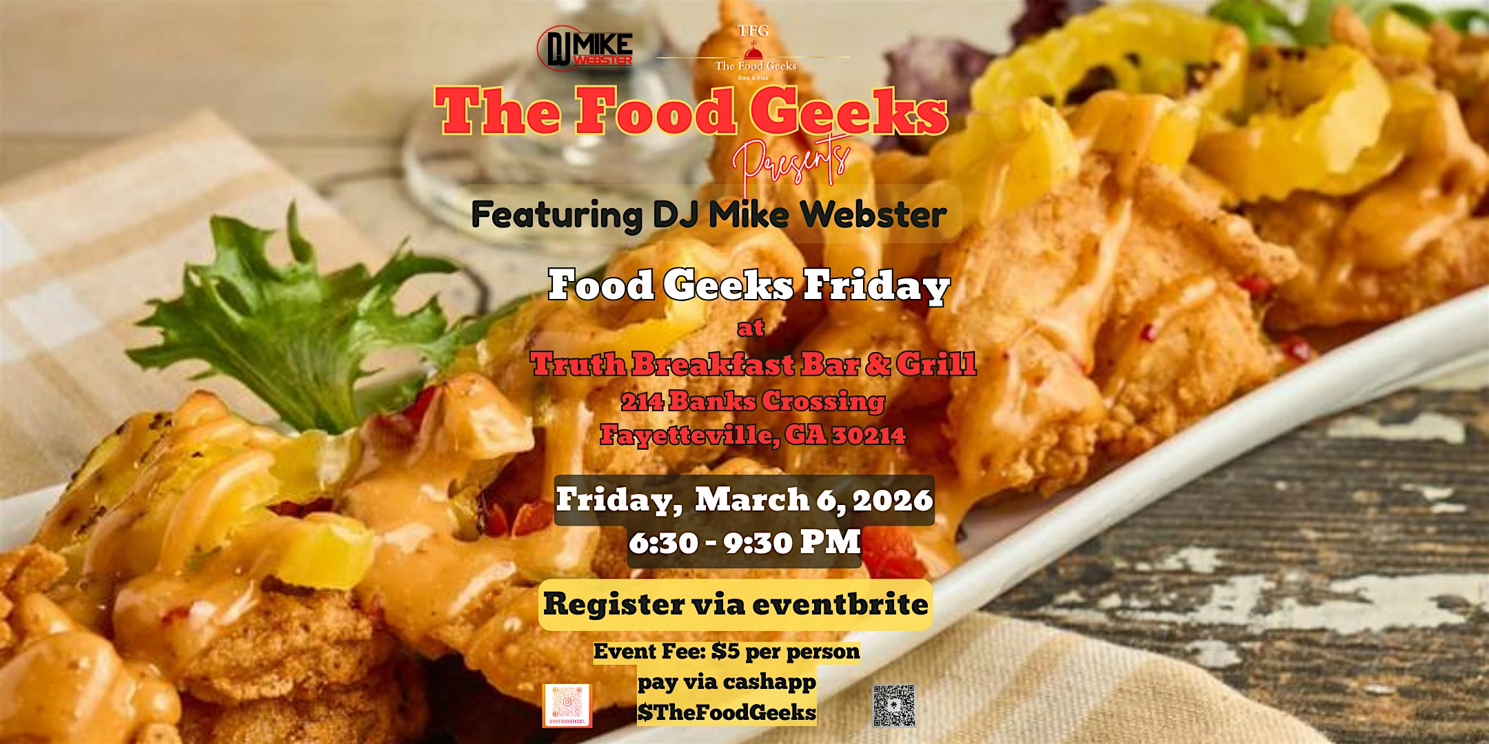 by admin27Feb Food Geeks Friday at Truth Breakfast Bar & Grill at Truth Breakfast Bar and Grill – Fayetteville, GA Food Geeks Friday at Truth Breakfast Bar & Grill at Truth Breakfast Bar and Grill – Fayetteville, GA 6 6 people viewed this event. Join us for a Food Geeks Friday at Truth Breakfast Bar & Grill to indulge in a culinary adventure like no other! Tickets-RSVP Link Date And Time Friday, March 6th, 2026 @ 06:00 PM Location 214 Banks Crossing, Fayetteville, GA 30214 Event Types Food & DrinkParty or Social Gathering Event Category AtlantaGeorgia Share With Friends Facebook Twitter Linkedin Xing Pinterest Share This Post: