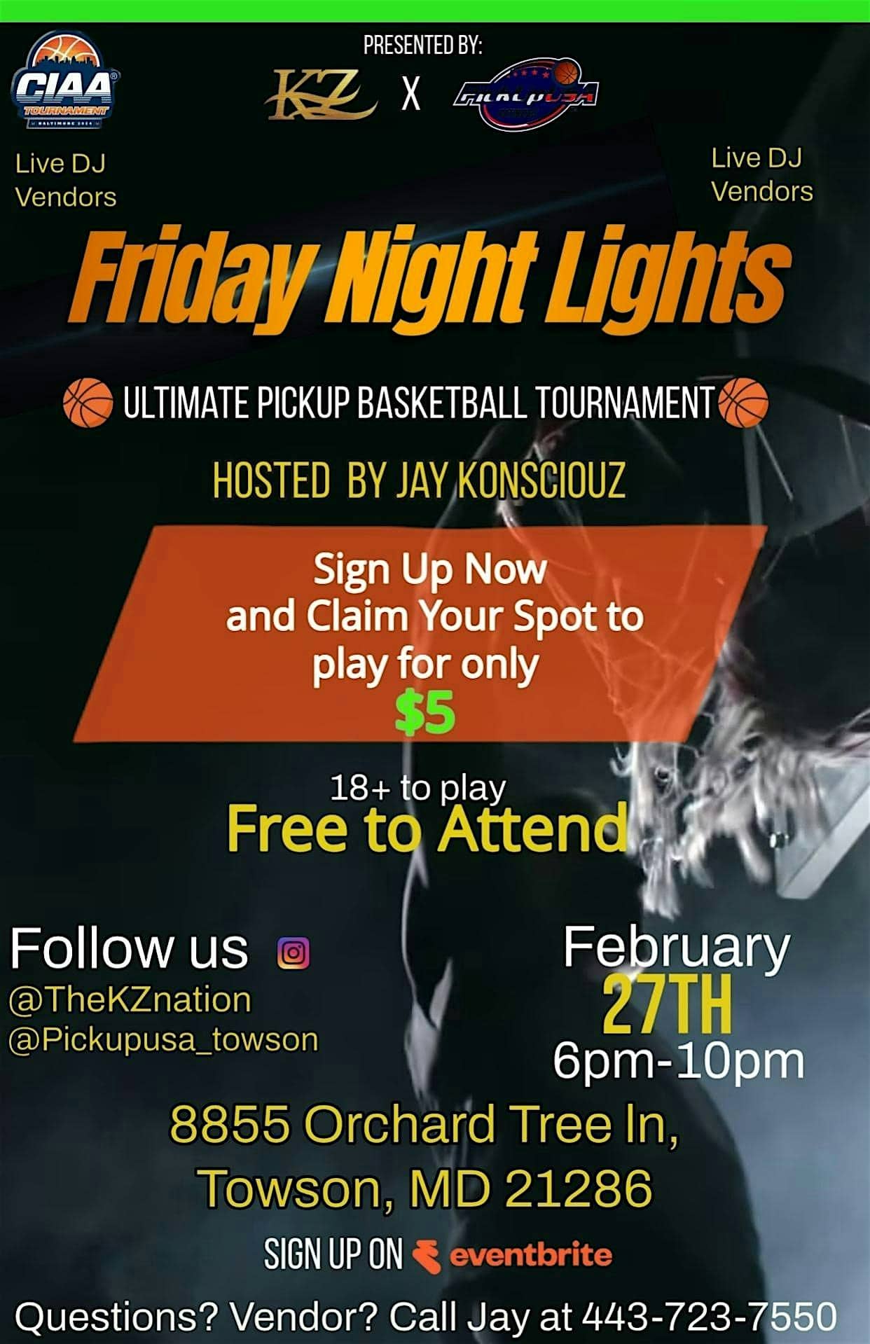 by admin23Feb Friday Night Lights: Ultimate Pick-Up Basketball Tournament at PickUp USA Fitness Towson – Towson, MD Friday Night Lights: Ultimate Pick-Up Basketball Tournament at PickUp USA Fitness Towson – Towson, MD 5 5 people viewed this event. Organized, refereed pickup basketball. fast games, real competition, every point counts. No drama. Just hoop. Tickets-RSVP Link Date And Time Friday, March 6th, 2026 @ 06:00 PM Location 8855 Orchard Tree Lane Event Types CIAASports & Fitness Event Category BaltimoreMaryland Share With Friends Facebook Twitter Linkedin Xing Pinterest Share This Post: