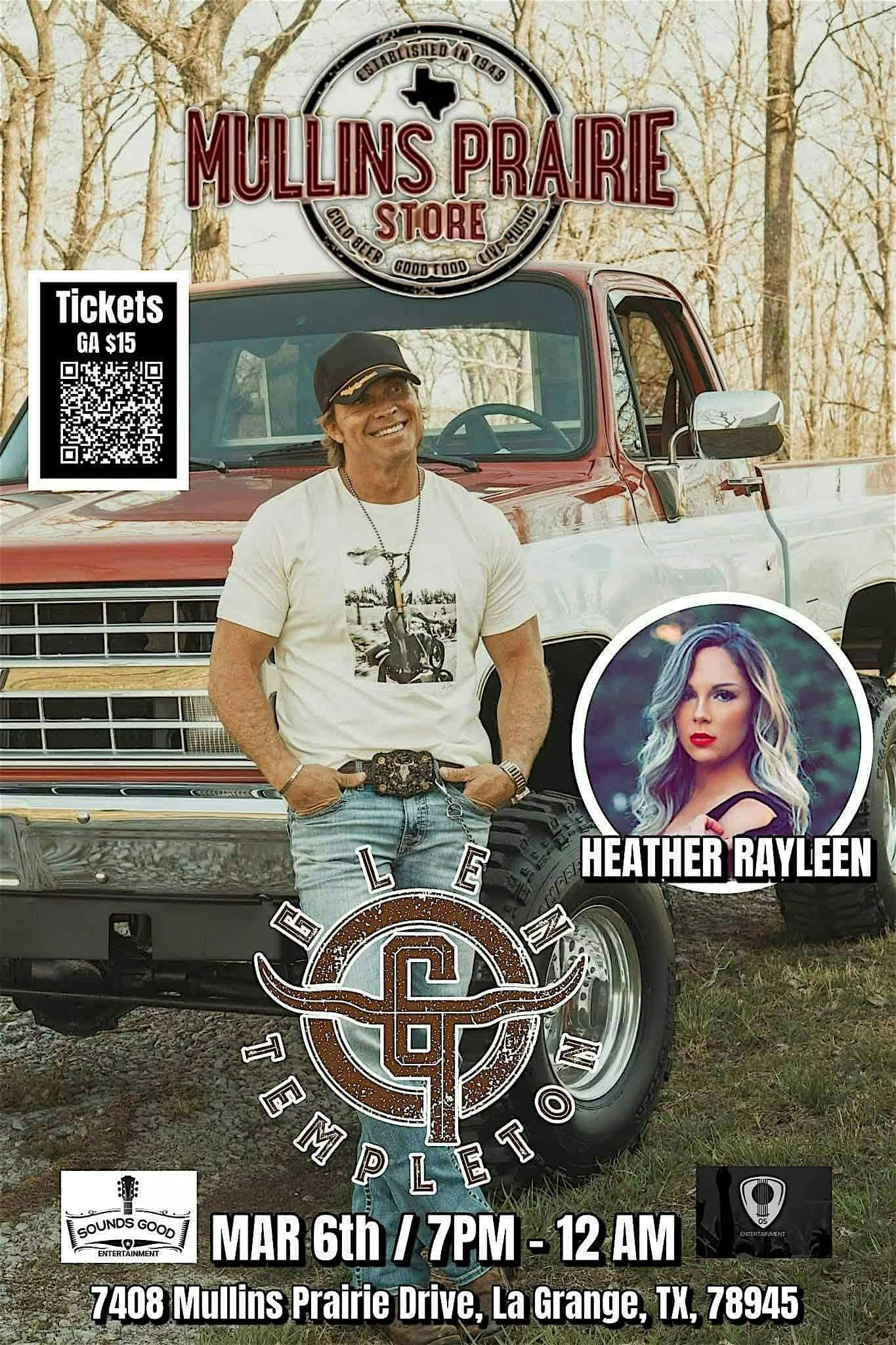 by admin23Feb Glen Templeton at Mullins Prairie Store at Mullins Prairie Store – La Grange, TX Glen Templeton at Mullins Prairie Store at Mullins Prairie Store – La Grange, TX 1 1 people viewed this event. Glen Templeton making his debut at Mullins Prairie Store with special guest Heather Rayleen. Tickets-RSVP Link Date And Time Friday, March 6th, 2026 07:00 PM (PST) Venue Mullins Prairie Store Location 7408 Mullins Prairie Loop, La Grange, TX 78945 Event Types Concert or PerformanceMusic Event Category Texas Share With Friends Facebook Twitter Linkedin Xing Pinterest Share This Post: