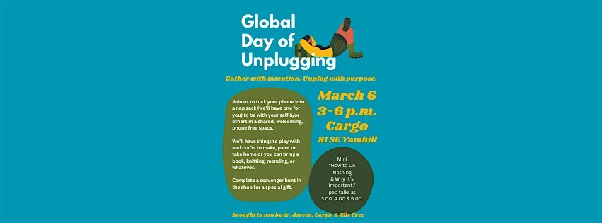 by admin23Feb Global Day of Unplugging Portland Style at Cargo – Portland, OR Global Day of Unplugging Portland Style at Cargo – Portland, OR 2 2 people viewed this event. Come do absolutely nothing or engage with supplies to make something, bring a project or book, and learn about how unplugging helps us. Tickets-RSVP Link Date And Time Friday, March 6th, 2026 @ 03:00 PM Location 81 Southeast Yamhill Street, Portland, OR 97214 Event Types Community & CultureParty or Social Gathering Event Category OregonPortland Share With Friends Facebook Twitter Linkedin Xing Pinterest Share This Post: