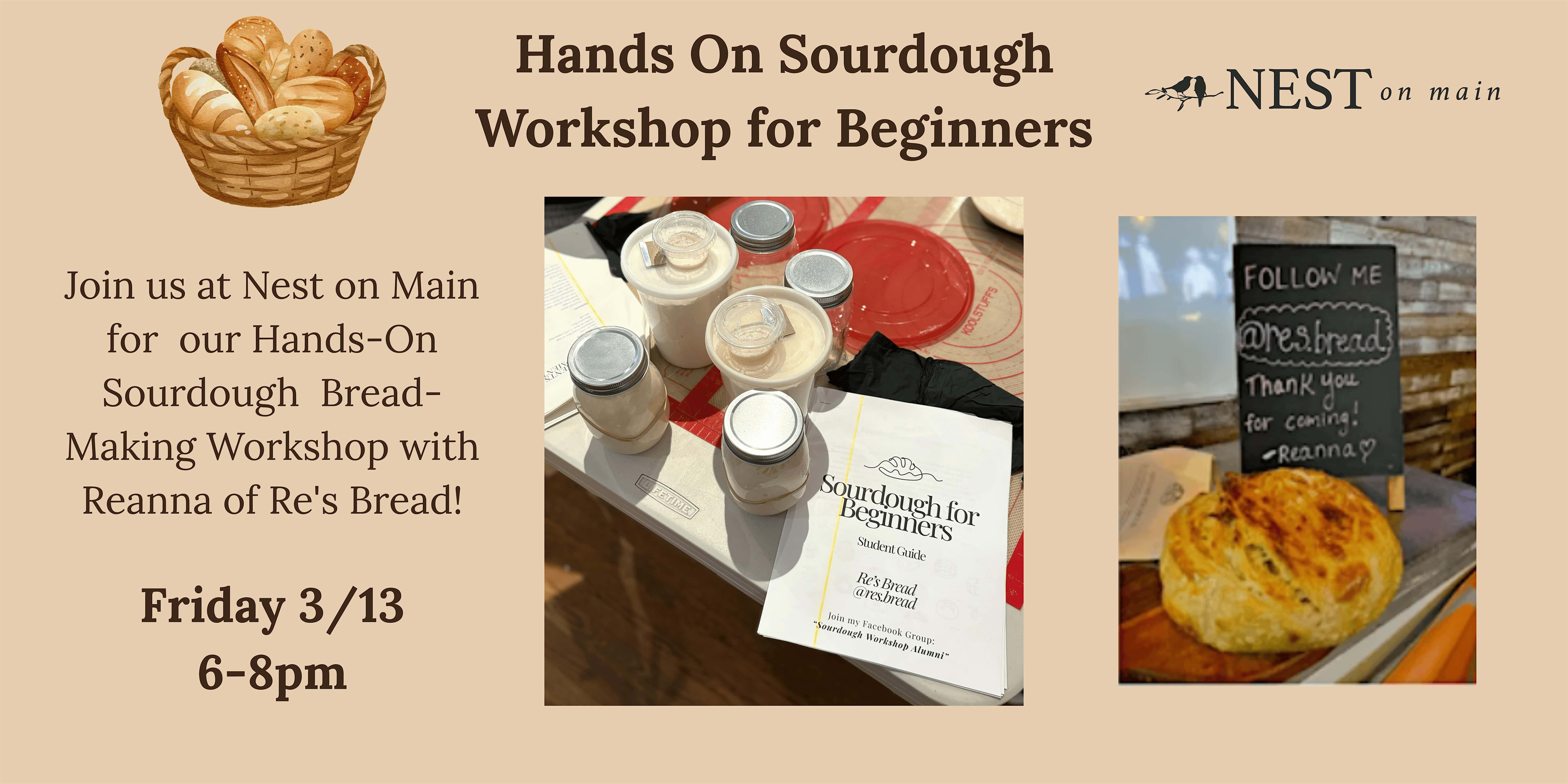 by admin23Feb Hands-On Sourdough Bread-Making Workshop w/Reanna of Re’s Bread at Nest on Main – Northport, NY Hands-On Sourdough Bread-Making Workshop w/Reanna of Re’s Bread at Nest on Main – Northport, NY 2 2 people viewed this event. Join us at Nest on Main for our Hands-On Sourdough Bread-Making Workshop with Reanna of Re’s Bread! Tickets-RSVP Link Date And Time Friday, March 6th, 2026 06:00 PM (PST) Venue Nest on Main Location 135 Main St., Northport, NY 11768 Event Types Food & Drink Event Category New York Share With Friends Facebook Twitter Linkedin Xing Pinterest Share This Post: