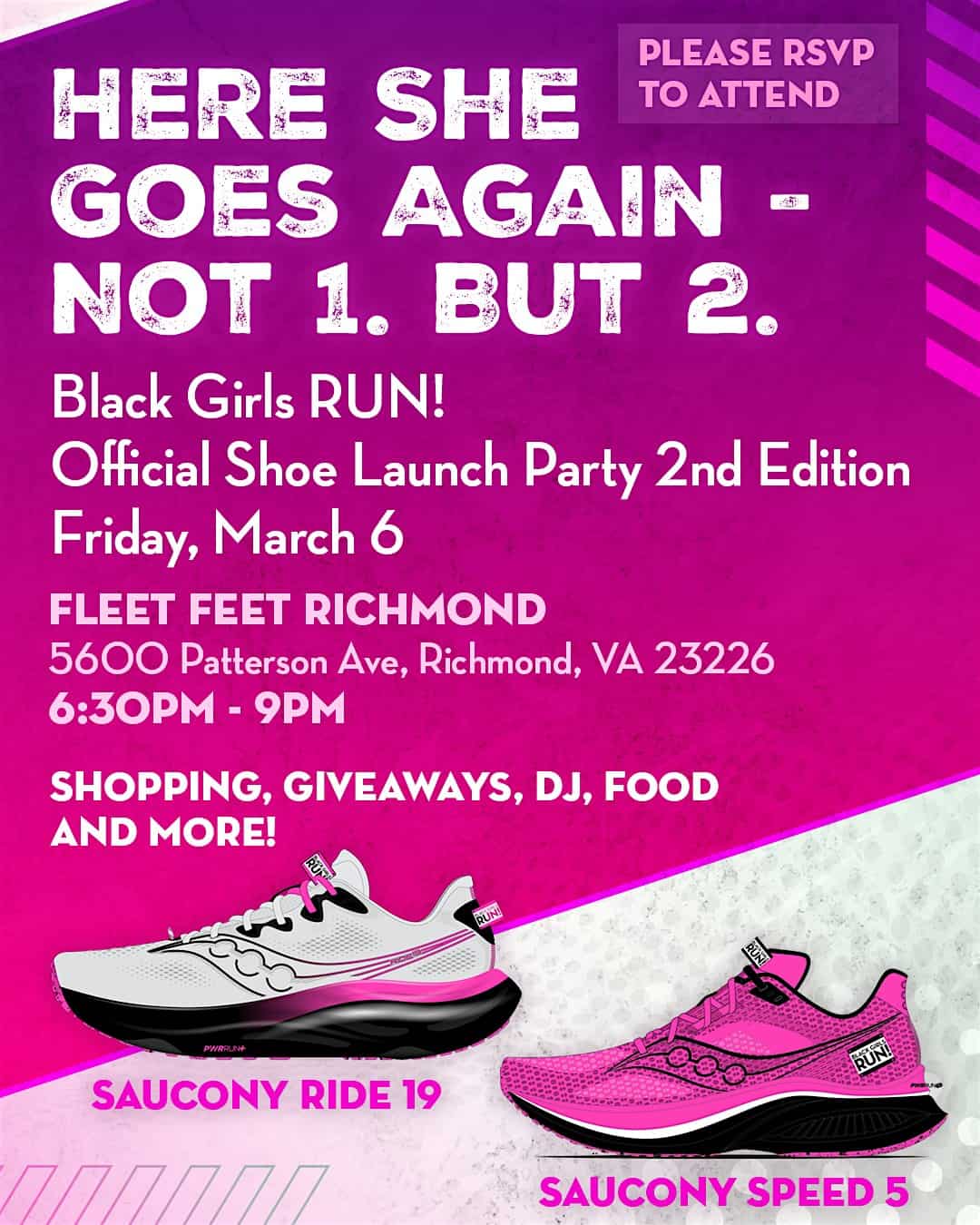 by admin23Feb Here She Goes Again. Not 1. But TWO! Official Shoe Launch Party at Fleet Feet Richmond – Westhampton – Richmond, VA Here She Goes Again. Not 1. But TWO! Official Shoe Launch Party at Fleet Feet Richmond – Westhampton – Richmond, VA 2 2 people viewed this event. Join us as Jay Ell Alexander, CEO of Black Girls RUN!, hosts her shoe launch party for the drop of her TWO brand new sneaker releases! Tickets-RSVP Link Date And Time Friday, March 6th, 2026 06:00 PM (PST) Venue Fleet Feet Richmond - Westhampton Location 5600 Patterson Avenue, Richmond, VA 23226 Event Types Party or Social Gathering Event Category Virginia Share With Friends Facebook Twitter Linkedin Xing Pinterest Share This Post: