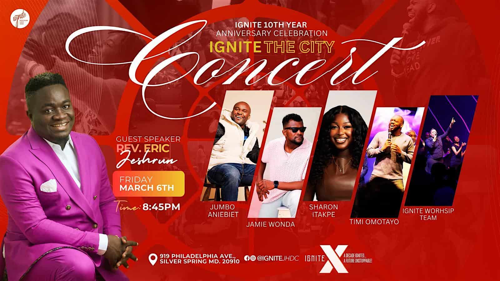 by admin23Feb Ignite The City Concert at Jesus House DC – Silver Spring, MD Ignite The City Concert at Jesus House DC – Silver Spring, MD 1 1 people viewed this event. Join our worship concert celebrating 10 years of Ignite Church. Expect powerful voices, live worship, and a city-shaking praise experience! Tickets-RSVP Link Date And Time Friday, March 6th, 2026 08:00 PM (PST) Venue Jesus House DC Location 919 Philadelphia Avenue, Silver Spring, MD 20910 Event Types Concert or PerformanceMusic Event Category MarylandSilver Spring Share With Friends Facebook Twitter Linkedin Xing Pinterest Share This Post: