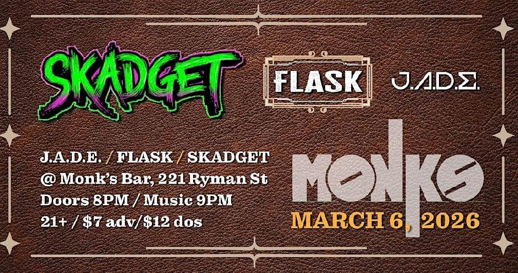 by admin23Feb J.A.D.E. + Skadget + Flask Live At Monk’s at Monk’s Bar – Missoula, MT J.A.D.E. + Skadget + Flask Live At Monk’s at Monk’s Bar – Missoula, MT 1 1 people viewed this event. Join us for a night of electrifying music with J.A.D.E., Skadget, and Flask at Monk’s! Tickets-RSVP Link Date And Time Friday, March 6th, 2026 08:00 PM (PST) Venue Monk's Bar Location 225 Ryman Street, Missoula, MT 59802 Event Types Concert or PerformanceMusic Event Category Montana Share With Friends Facebook Twitter Linkedin Xing Pinterest Share This Post: