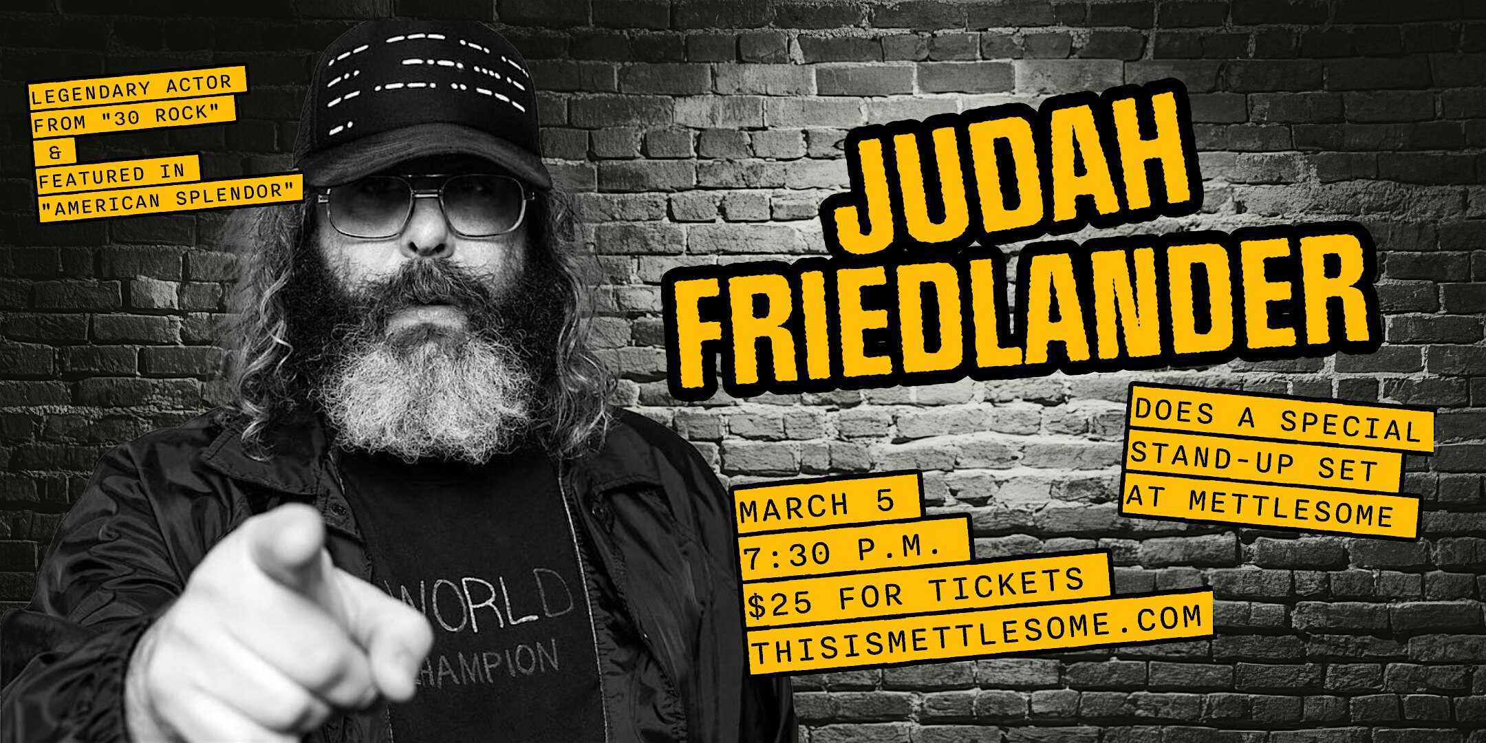 by admin14Feb Judah Friedlander: Standup Comedy at Mettlesome at Mettlesome at Golden Belt – Durham, NC Judah Friedlander: Standup Comedy at Mettlesome at Mettlesome at Golden Belt – Durham, NC 1 1 people viewed this event. Known for his role on 30 Rock and his signature satirical style Judah Friedlander brings his stand-up to Durham. Tickets-RSVP Link Date And Time Friday, March 6th, 2026 12:00 AM (PST) Venue Mettlesome at Golden Belt Location 800 Taylor St, Durham, NC 27701 Event Types Concert or PerformancePerforming & Visual Arts Event Category DurhamNorth Carolina Share With Friends Facebook Twitter Linkedin Xing Pinterest Share This Post: