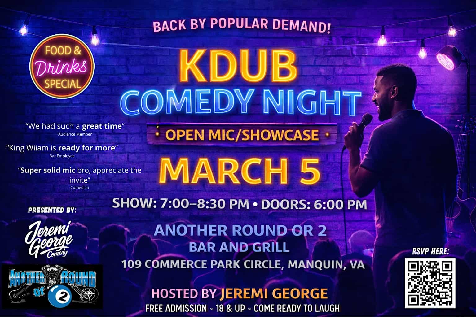 by admin14Feb KDub Comedy Night at Another Round or 2 Bar & Grill – Manquin, VA KDub Comedy Night at Another Round or 2 Bar & Grill – Manquin, VA 1 1 people viewed this event. Get ready to laugh out loud at KDub Comedy Night, where the jokes fly and good vibes roll! Tickets-RSVP Link Date And Time Friday, March 6th, 2026 12:00 AM (PST) Venue Another Round or 2 Bar & Grill Location 109 Commons Park Circle, Manquin, VA 23106 Event Types Concert or PerformancePerforming & Visual Arts Event Category Virginia Share With Friends Facebook Twitter Linkedin Xing Pinterest Share This Post: