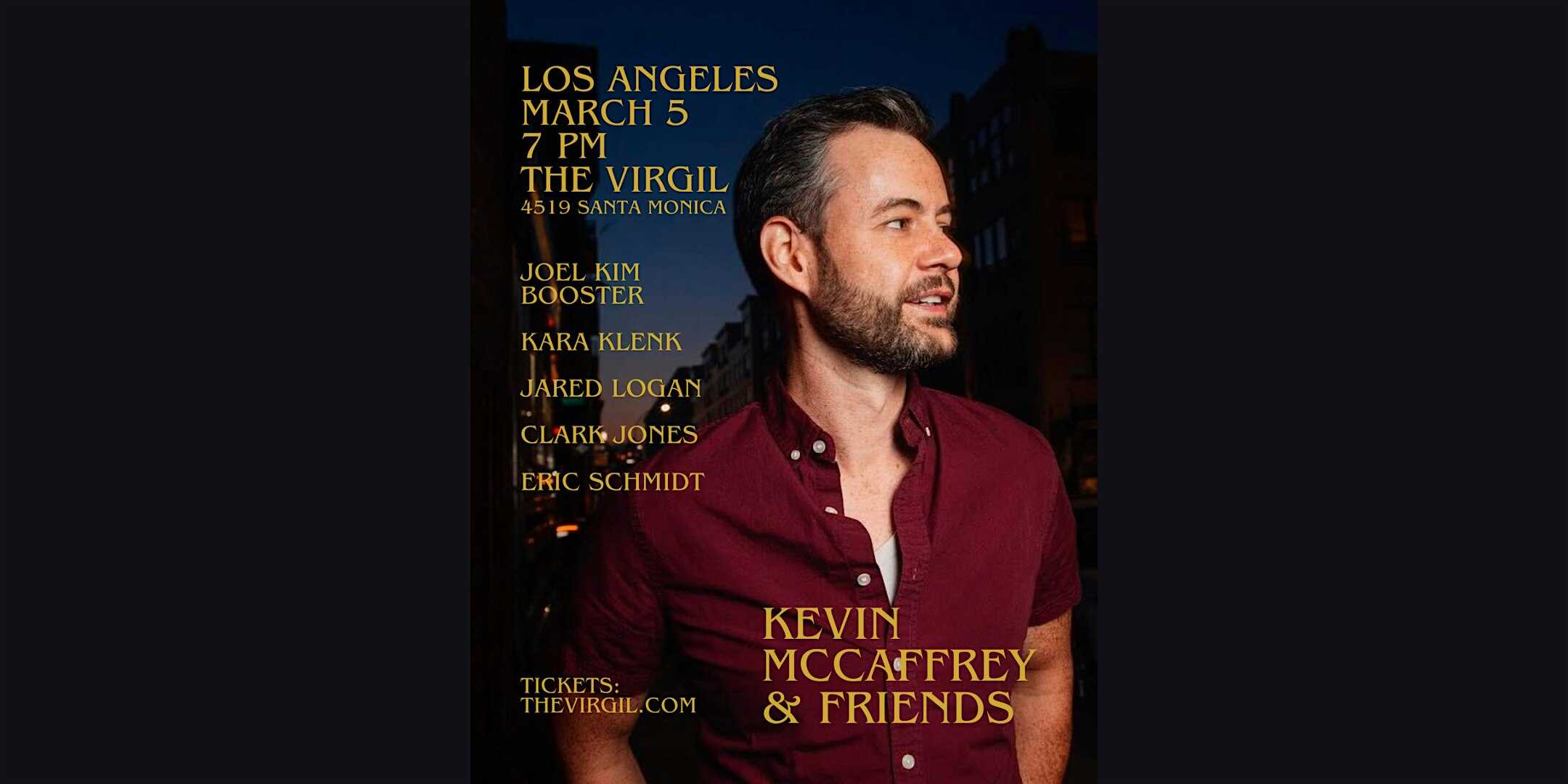 by admin14Feb Kevin McCaffrey & Friends at The Virgil – Los Angeles, CA Kevin McCaffrey & Friends at The Virgil – Los Angeles, CA 3 3 people viewed this event. Kevin McCaffrey is joined by Joel Kim Booster, Kara Klenk, Jared Logan, Clark Jones, and Eric Schmidt for a stand up comedy event. Tickets-RSVP Link Date And Time Friday, March 6th, 2026 03:00 AM (PST) Venue The Virgil Location 4519 Santa Monica Boulevard, Los Angeles, CA 90029 Event Types Concert or PerformancePerforming & Visual Arts Event Category CaliforniaLos Angeles Share With Friends Facebook Twitter Linkedin Xing Pinterest Share This Post: