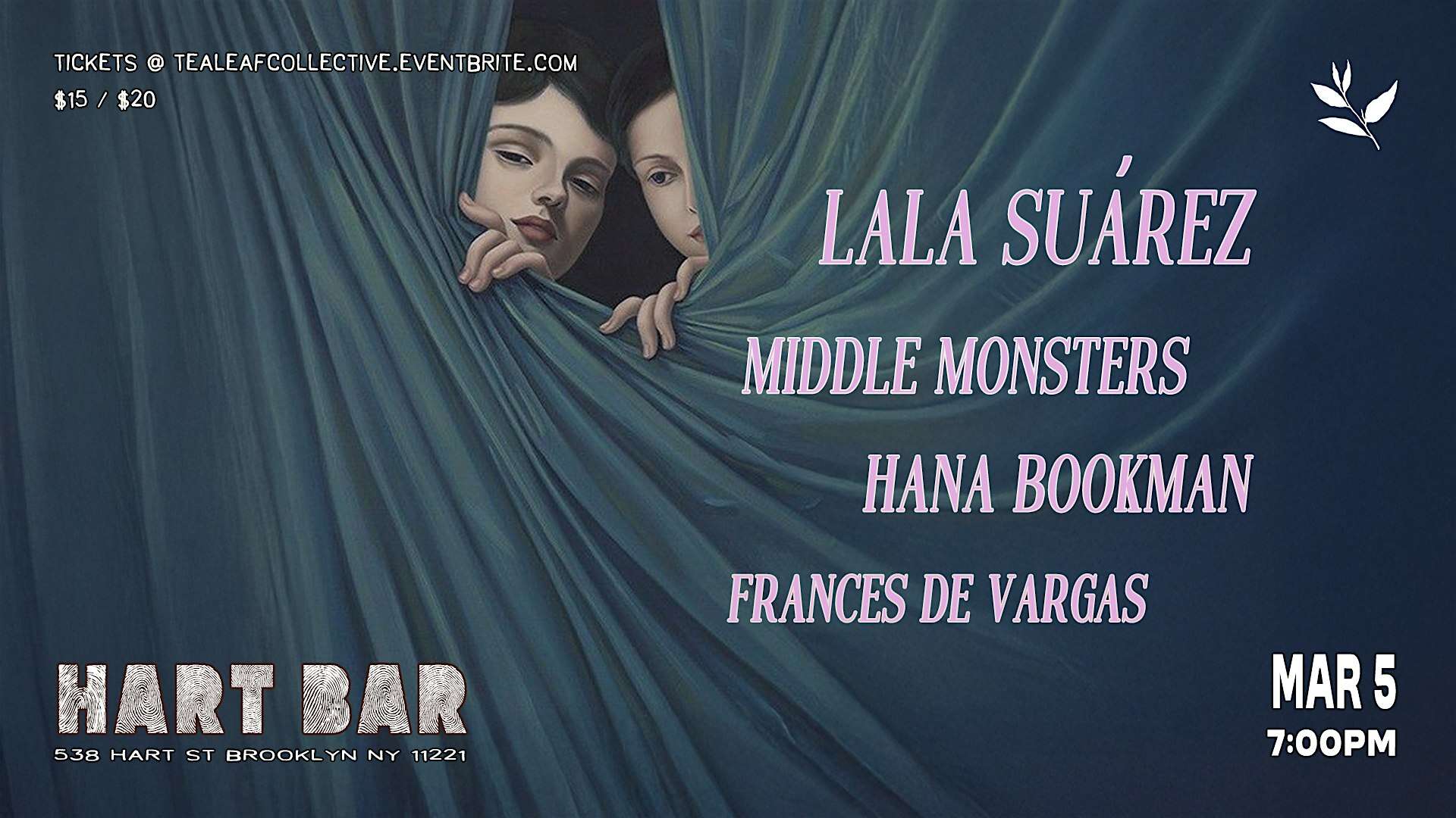 by admin14Feb Lala Suárez / Middle Monsters / Hana Bookman / Frances De Vargas at Hart Bar – Brooklyn, NY Lala Suárez / Middle Monsters / Hana Bookman / Frances De Vargas at Hart Bar – Brooklyn, NY 1 1 people viewed this event. Lala Suárez / Middle Monsters / Hana Bookman / Frances De Vargas at Hart Bar on March 5th. Tickets-RSVP Link Date And Time Friday, March 6th, 2026 12:00 AM (PST) Venue Hart Bar Location 538 Hart Street, Brooklyn, NY 11221 Event Types Concert or PerformancePerforming & Visual Arts Event Category New York Share With Friends Facebook Twitter Linkedin Xing Pinterest Share This Post:
