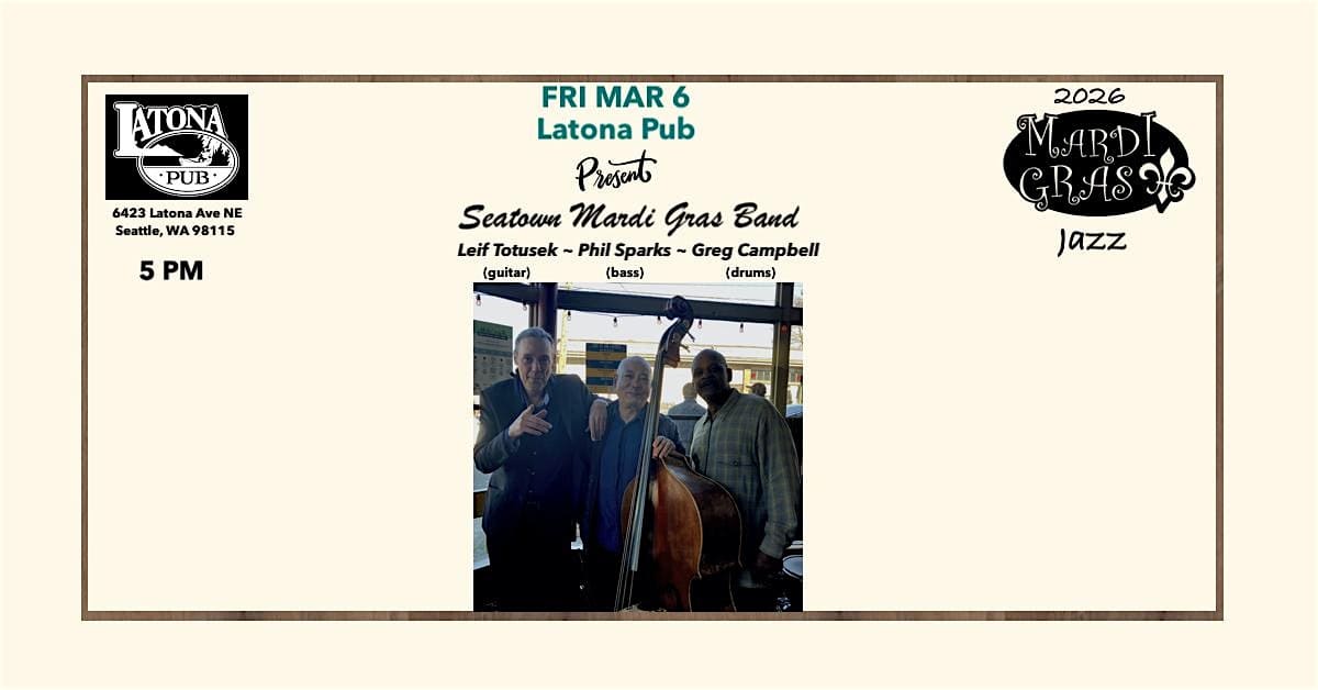 by admin23Feb Latona Pub Presents … Leif Totusek “Seatown Mardi Gras Band” at Latona Pub – Seattle, WA Latona Pub Presents … Leif Totusek “Seatown Mardi Gras Band” at Latona Pub – Seattle, WA 1 1 people viewed this event. Get ready to groove with Leif Totusek at Seatown Mardi Gras Band, only at Latona Pub—let’s party! Tickets-RSVP Link Date And Time Friday, March 6th, 2026 05:00 PM (PST) Venue Latona Pub Location 6423 Latona Ave NE, Seattle, WA 98115 Event Types Concert or PerformanceMusic Event Category SeattleWashington Share With Friends Facebook Twitter Linkedin Xing Pinterest Share This Post: