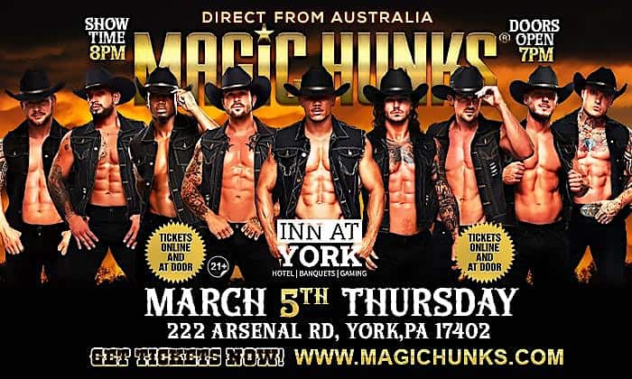 by admin14Feb MAGIC HUNKS® AUSTRALIA TAKEOVER YORK, PA USA!!! at Inn at York – York, PA MAGIC HUNKS® AUSTRALIA TAKEOVER YORK, PA USA!!! at Inn at York – York, PA 1 1 people viewed this event. 3/5 – Australia’s Perfect ladies night event is coming to York for one night only! Grab your tickets now for the best girls night ever! 21+ Tickets-RSVP Link Date And Time Friday, March 6th, 2026 01:00 AM (PST) Venue Inn at York Location 222 Arsenal Road, York, PA 17402 Event Types Concert or PerformancePerforming & Visual Arts Event Category Pennsylvania Share With Friends Facebook Twitter Linkedin Xing Pinterest Share This Post: