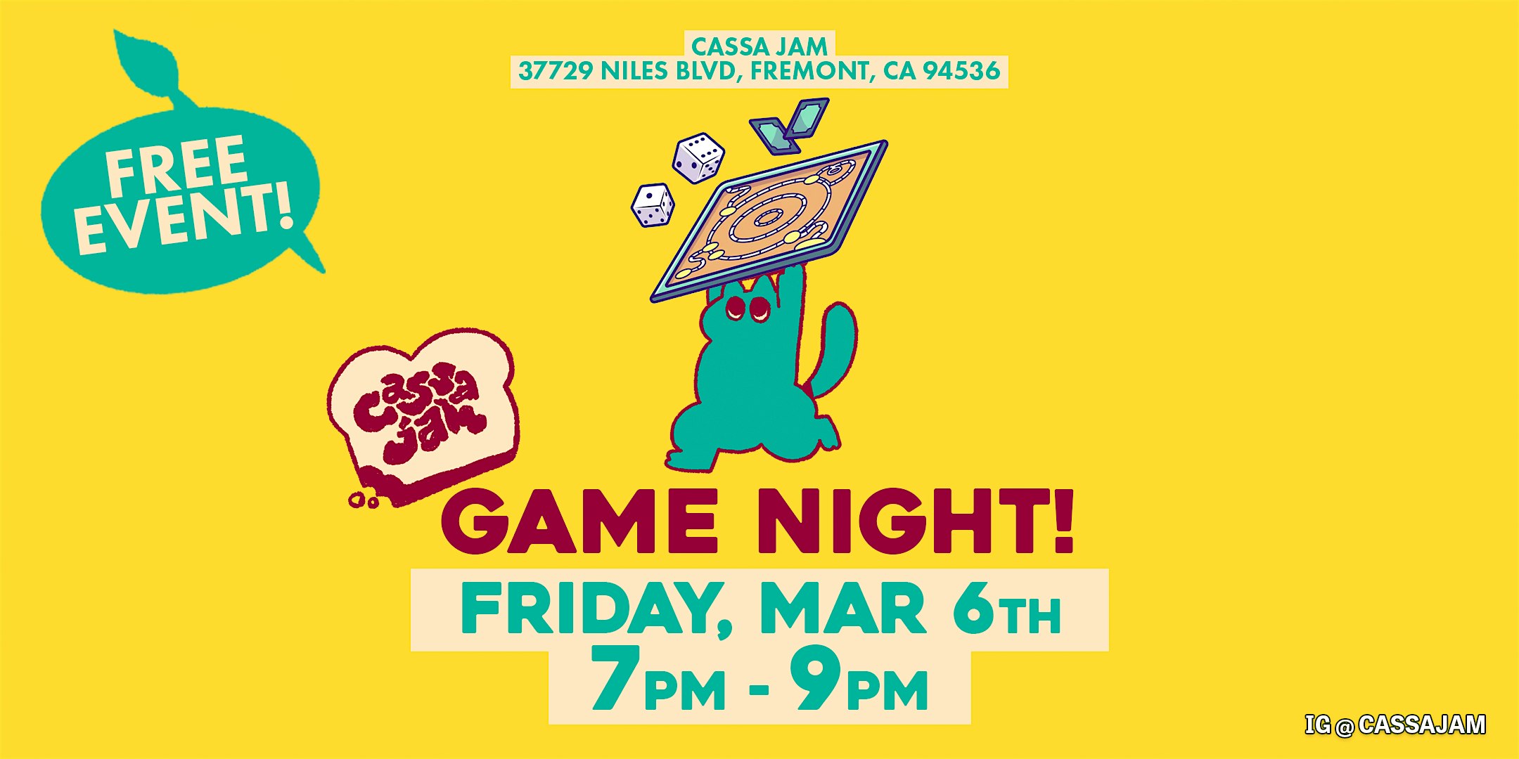 by admin27Feb March Game Night! | FREE event in Fremont / Niles District at Cassa Jam – Fremont, CA March Game Night! | FREE event in Fremont / Niles District at Cassa Jam – Fremont, CA 1 1 people viewed this event. Come hang out and play board & card games at Cassa Jam! Free event on Friday night! Tickets-RSVP Link Date And Time Friday, March 6th, 2026 07:00 PM (PST) Venue Cassa Jam Location 37729 Niles Boulevard, Fremont, CA 94536 Event Types Party or Social Gathering Event Category CaliforniaSan Jose Share With Friends Facebook Twitter Linkedin Xing Pinterest Share This Post: