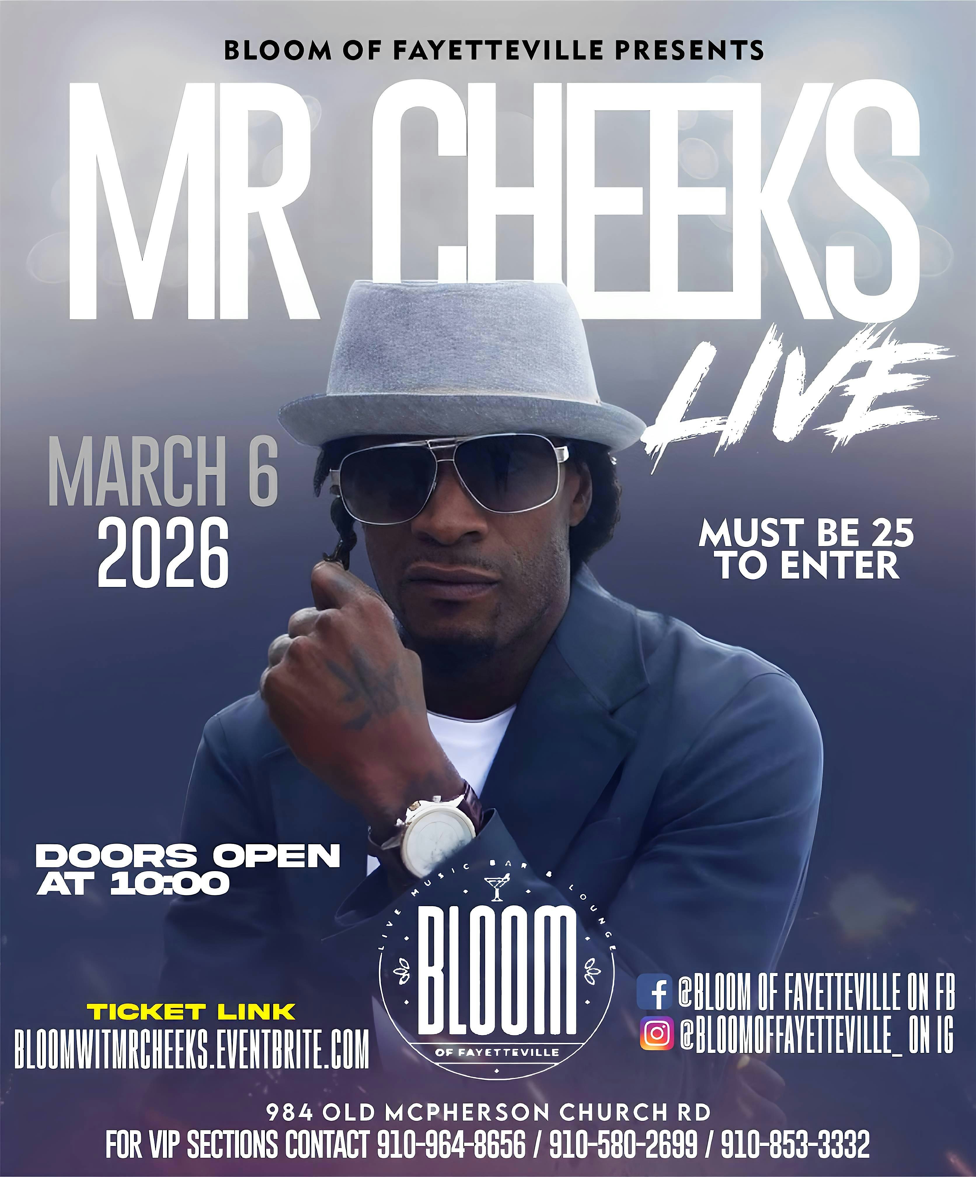 by admin27Feb MR. CHEEKS LIVE @ BLOOM at Bloom of Fayetteville – Fayetteville, NC MR. CHEEKS LIVE @ BLOOM at Bloom of Fayetteville – Fayetteville, NC 2 2 people viewed this event. Mr. Cheeks live at Bloom of Fayetteville March 6th! Mature, sexy vibes, grown & classy energy. Doors open 10PM! #Welcome2BloomBaby Tickets-RSVP Link Date And Time Friday, March 6th, 2026 10:00 AM (PST) Venue Bloom of Fayetteville Location 984 South Old McPherson Church Road, Fayetteville, NC 28303 Event Types Concert or PerformanceMusic Event Category North Carolina Share With Friends Facebook Twitter Linkedin Xing Pinterest Share This Post: