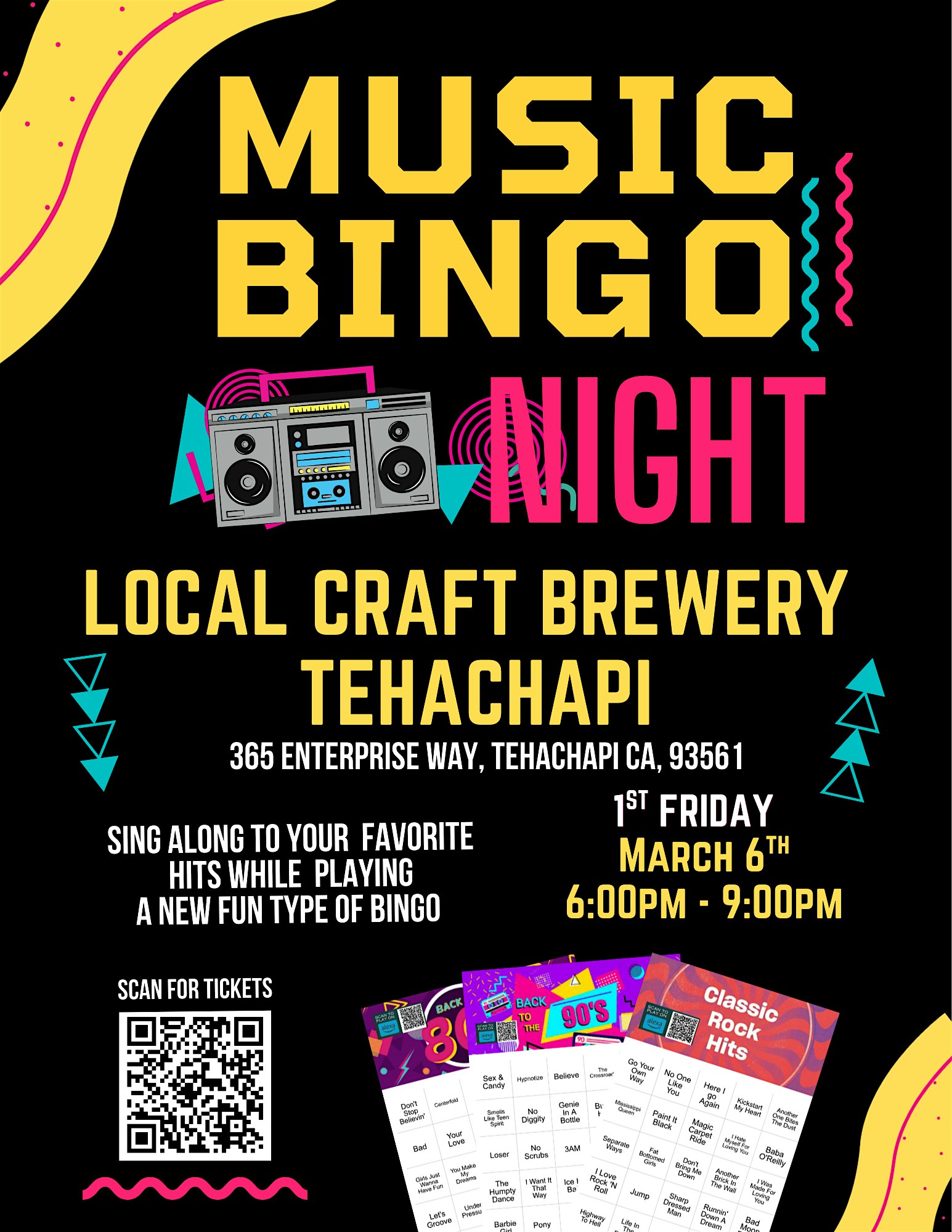 by admin27Feb Music Bingo Night @ LCB Tehachapi at Local Craft Beer – Tehachapi, CA Music Bingo Night @ LCB Tehachapi at Local Craft Beer – Tehachapi, CA 1 1 people viewed this event. Decades Music Bingo Night is returning to LCB Tehachapi. We will be doing several new themes that the audience will vote on. Tickets-RSVP Link Date And Time Friday, March 6th, 2026 06:00 PM (PST) Venue Local Craft Beer Location 365 Enterprise Way, Tehachapi, CA 93561 Event Types Concert or PerformanceMusic Event Category California Share With Friends Facebook Twitter Linkedin Xing Pinterest Share This Post: