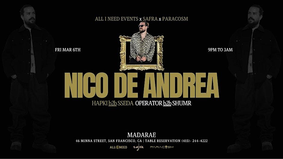 by admin27Feb Nico De Andrea at Madarae at Madarae – San Francisco, CA Nico De Andrea at Madarae at Madarae – San Francisco, CA 1 1 people viewed this event. All I Need Event x Safra x Paracosm brings a talented Afro House music producer, Nico De Andrea, on March 6th! Tickets-RSVP Link Date And Time Friday, March 6th, 2026 09:00 PM (PST) Venue Madarae Location 46 Minna Street, San Francisco, CA 94105 Event Types MusicParty or Social Gathering Event Category CaliforniaSan Francisco Share With Friends Facebook Twitter Linkedin Xing Pinterest Share This Post: