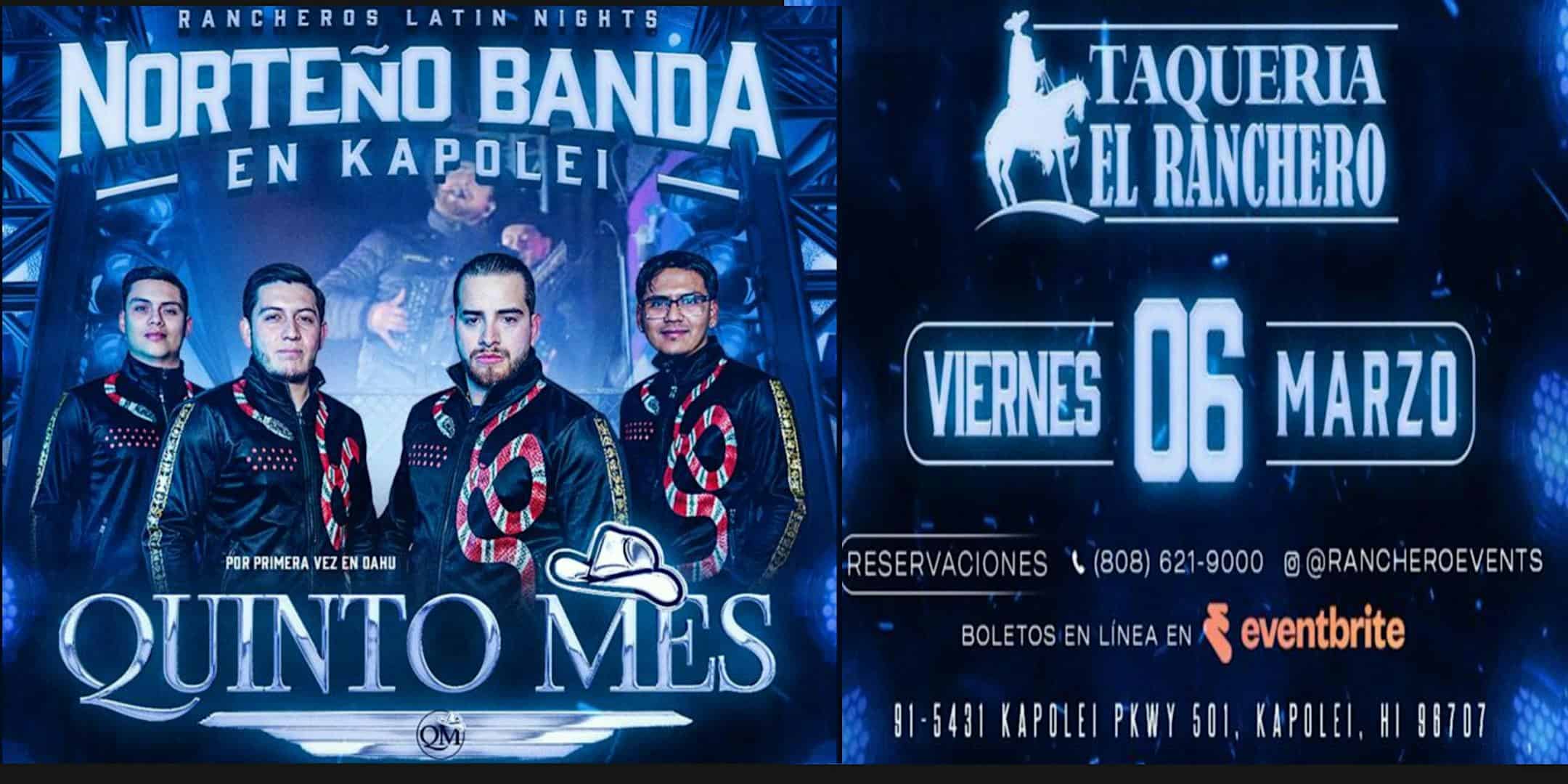 by admin23Feb Norteño Banda en Kapolei at 91-5431 Kapolei Pkwy – Kapolei, HI Norteño Banda en Kapolei at 91-5431 Kapolei Pkwy – Kapolei, HI 1 1 people viewed this event. Noche de grupo norteño banda en Kapolei, Hawaii. Grupo Quinto Mes directamente de Los Angeles, California. Tocando todos sus éxitos. Tickets-RSVP Link Date And Time Friday, March 6th, 2026 09:00 PM (PST) Venue 91-5431 Kapolei Pkwy Location 91-5431 Kapolei Parkway, Kapolei, HI 96707 Event Types Concert or PerformanceMusic Event Category HawaiiHonolulu Share With Friends Facebook Twitter Linkedin Xing Pinterest Share This Post: